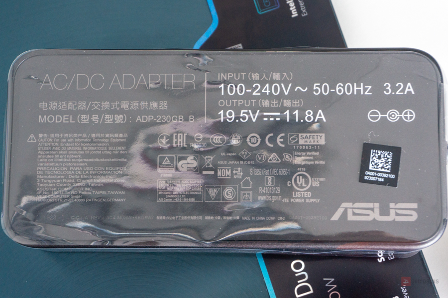 อะแดปเตอร์ตัวเครื่องขนาดค่อนข้างใหญ่และหนัก จ่ายไฟสูงสุด 230W ซึ่งเวลาพกพาไปไหนมาไหนอาจจะลำบากสักหน่อยเพราะเมื่อรวมกับน้ำหนักตัวเครื่อง ASUS ZenBook Pro Duo แล้วรวมกันก็เกือบๆ 4 กิโลได้ ส่วนตัวแผ่นรองด้านข้างจะเป็นแบบแม่เหล็ก