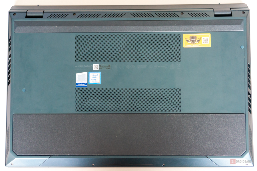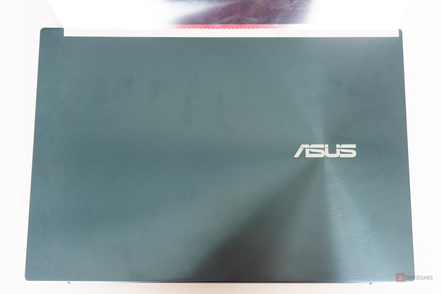 ฝาบนดีไซน์เป็นเส้นวงกลมกระจายรัศมีออกไปจากโลโก้ ASUS ดูสวยงามตามแบบฉบับ ZenBook ปกติ ด้านล่างจะมียางรองแผ่นใหญ่ช่วยยกตัวเครื่องให้สูงขึ้น พร้อมกับสติ๊กเกอร์ Windows แท้ และใช้ Intel Core i7 แกนฝาพับสองแกนช่วยยกตัวเครื่องให้สูงขึ้นแบบ ErgoLift เพื่อเวลาพิมพ์จะได้ยกข้อมือให้สูงขึ้น