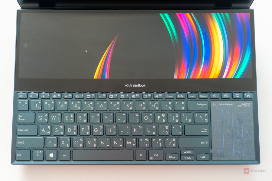 หน้าจอ ASUS ZenBook Pro Duo ดีไซน์ออกมาเป็นแบบ NanoEdge ขอบบางพิเศษทั้งสี่ด้าน ทำให้บอดี้ไซต์ตัวเครื่องเท่ากับโน้ตบุ๊ค 14 นิ้วธรรมดา ส่วนทางด้านจอสองจะอยู่ด้านล่างสัดส่วน 21:9 อยู่เหนือคีย์บอร์ดที่เป็นขนาด Full Size มาตรฐาน มีแป้น Numpad กับ Touchpad อยู่ด้วยกันด้านขวา พร้อมกับมีไฟ Backlit สีขาวปรับระดับความสว่างได้ 3 ระดับ