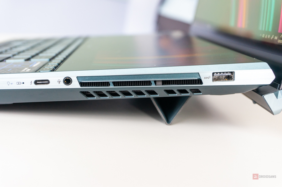 ถัดมาดีไซน์ด้านข้างออกแบบหนาพอสมควร เพราะต้องวางตำแหน่งช่องระบายความร้อน ซึ่งปกติแล้วช่องระบายความร้อนโน้ตบุ๊ครุ่นใหม่ๆ จะอยู่ด้านหลัง แต่ ASUS ZenBook Pro Duo กลับย้ายมาด้านข้างซ้ายขวาแทน ซึ่งจะมีข้อเสียที่ถ้าหากเราใช้เมาส์มือขวา ลมร้อนเป่าออกมาโดนมือ