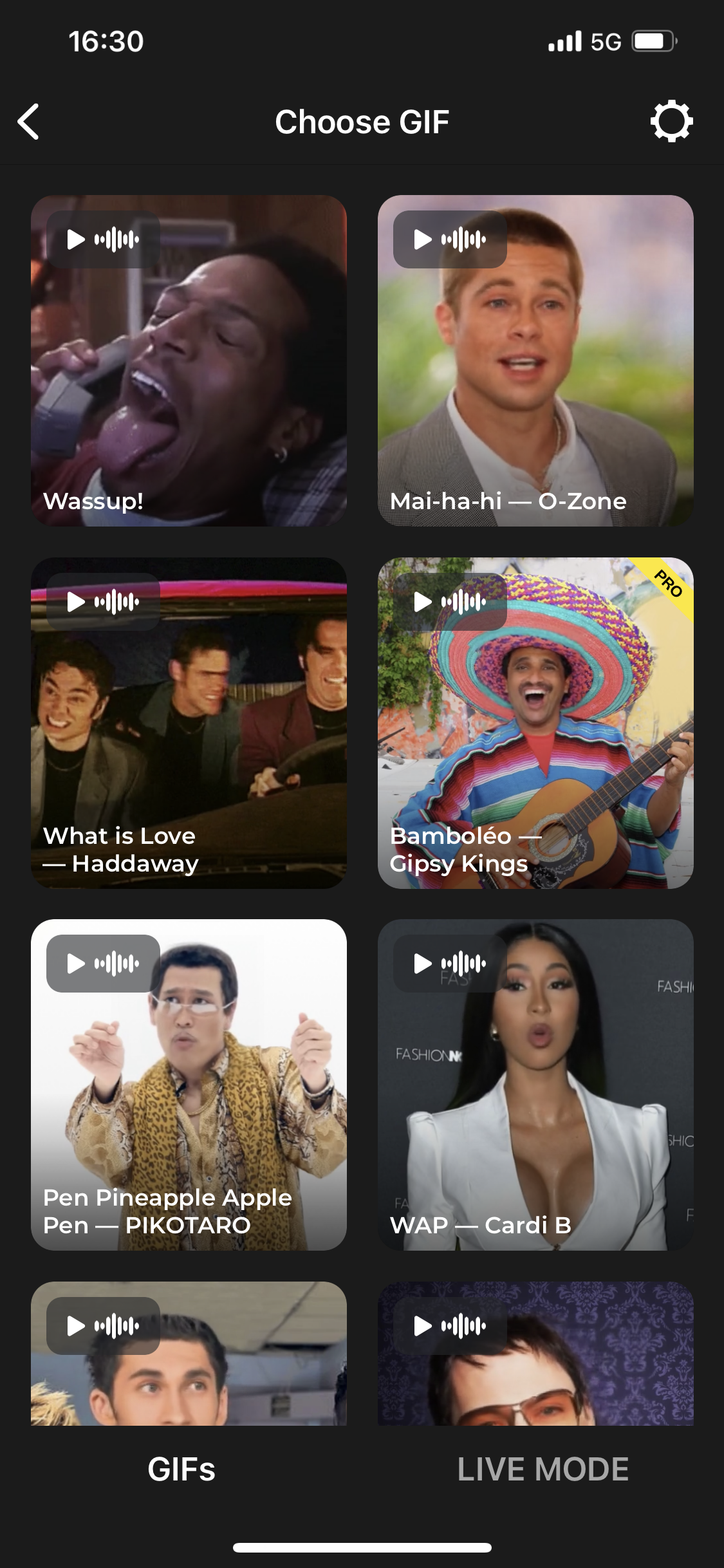 พอเลือกรูปที่ต้องการเสร็จแล้ว ก็จะข้ามไปหน้าเลือกภาพเคลื่อนไหวแบบ GIFs ที่มีให้เลือกมากกว่า 50 แบบ มีทั้งคลิปเพลงลิขสิทธิ์สั้น ๆ รวมถึงข้อความฮา ๆ แต่ถ้าไม่เลือกแบบ GIFs ก็สามารถเลือกแบบLive Mode ซึ่งจะ Sync การเคลื่อนไหวจากใบหน้าของเราเอง ให้สามารถขยับปากหรือหน้าของรูปได้ตามการเคลื่อนไหวของเราเด๊ะ ๆ นั่นเองครับ เมื่อเลือกแล้วหลังจากนั้นแอปก็จะมีการประมวลผลสักครู่