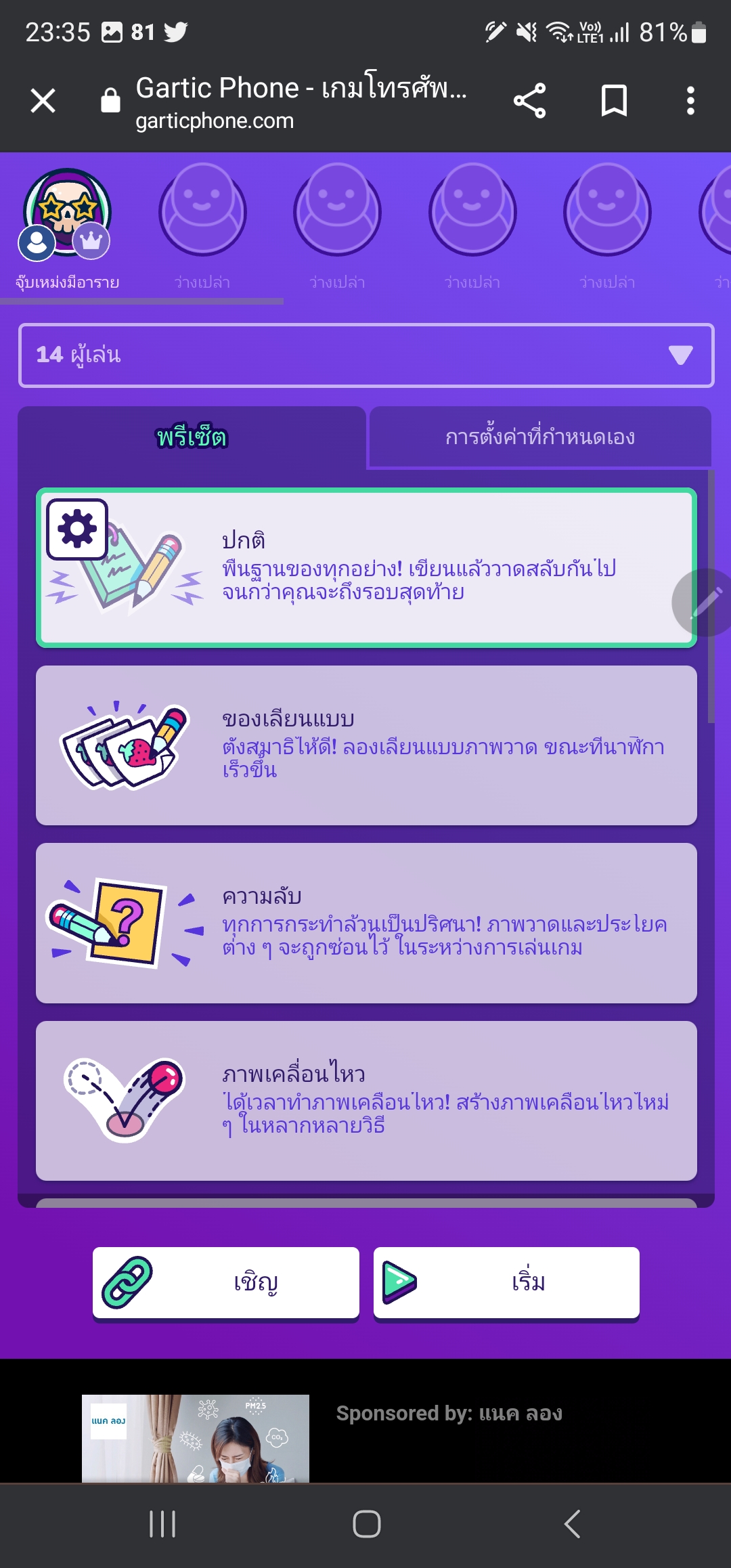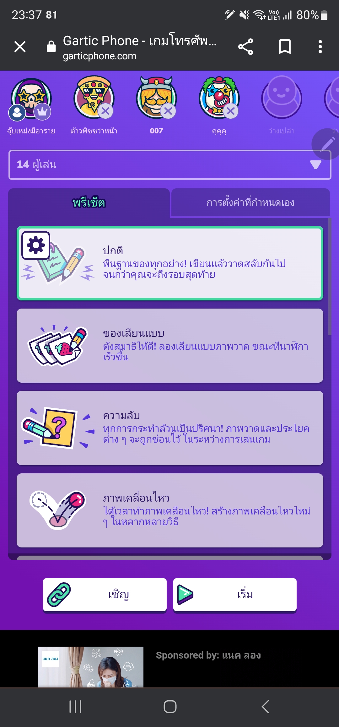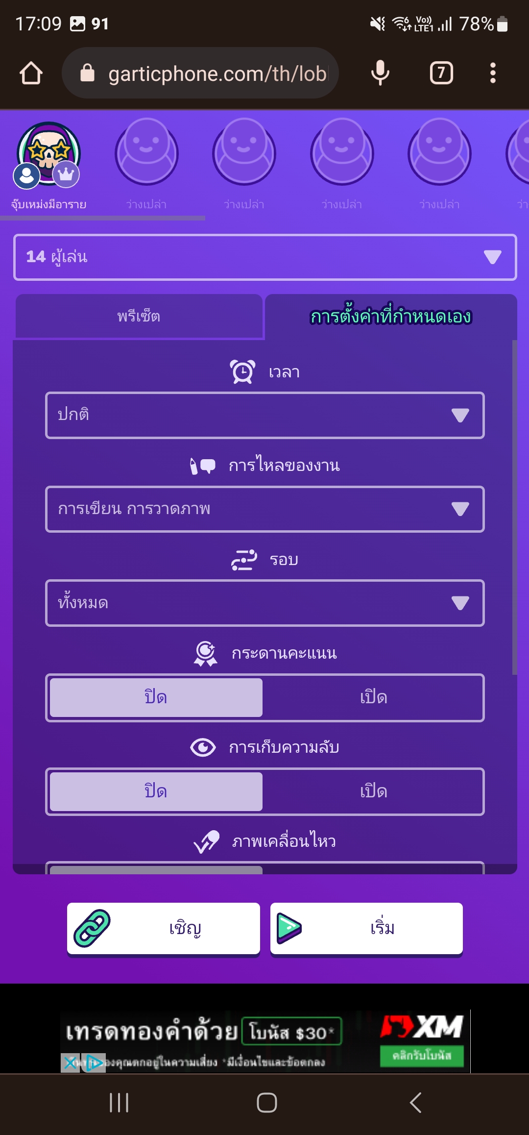 เมื่อเข้ามาในเว็บไซต์ Gartic Phone เราจะพบกับตัวละครที่สามารถเปลี่ยนได้มากกว่า 15 ตัว พร้อมตั้งชื่อได้ตามใจชอบ เมื่อกดเริ่มเกมเพื่อน ๆ จะพบช่องผู้เล่นที่สามารถกำหนดได้มากถึง 50 คนภายในเกม พร้อมค่าพรีเซ็ต สำหรับเลือกประเภทเกมที่ต้องการเล่น ส่วนแถบด้านขวาสุดจะเป็นการกำหนดค่าต่าง ๆ ได้ทั้งการเขียน หรือเวลาที่อยากกำหนดเอง แต่ถ้าให้แนะนำเล่นตามค่าพรีเซ็ตเกมจะเพลินกว่าล่ะ ถัดมาด้านล่างเพื่อน ๆ จะพบกับ ลิงค์เชิญเพื่อน และ การกดเริ่มเกม