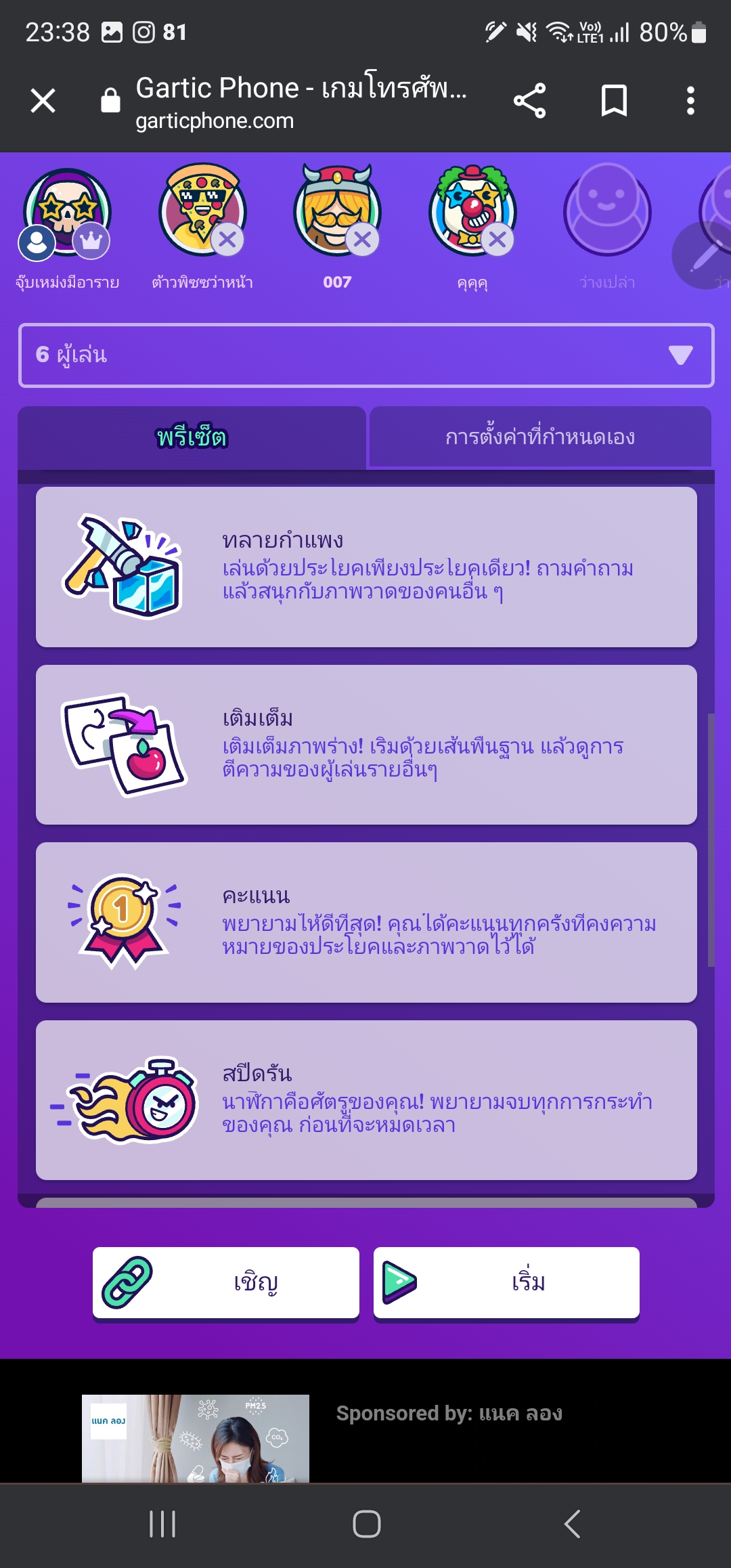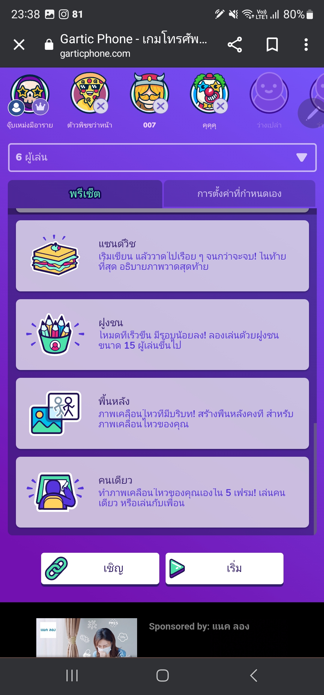 - โหมดทลายกำแพง เล่นด้วยประโยคเดียว ถามคำถามแล้วสนุกกับภาพวาดของเพื่อนคนอื่น