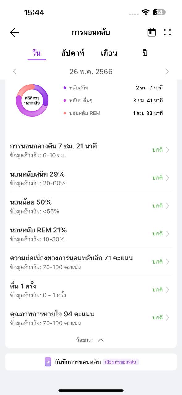 ระบบ TruSleep 3.0 จะตรวจจับการนอนหลับในทุกนาที เพื่อให้เรารู้ว่าการนอนของเรามีปัญหามั้ย โดยจะวัดผลอย่างละเอียดเลยว่าในคืนนึงเราหลับสนิท, หลับ ๆ ตื่น ๆ, หรือนอนหลับ REM หรือหลับช่วงฝัน นับแล้วกี่ชั่วโมง พร้อมทั้งตีเป็นเปอร์เซ็นและวัดผลให้ว่าปกติหรือไม่ ตลอดจนวัดคุณภาพของการหายใจได้ด้วย ซึ่งอันนี้เป็นตัวอย่างผลที่ได้ค่ะ