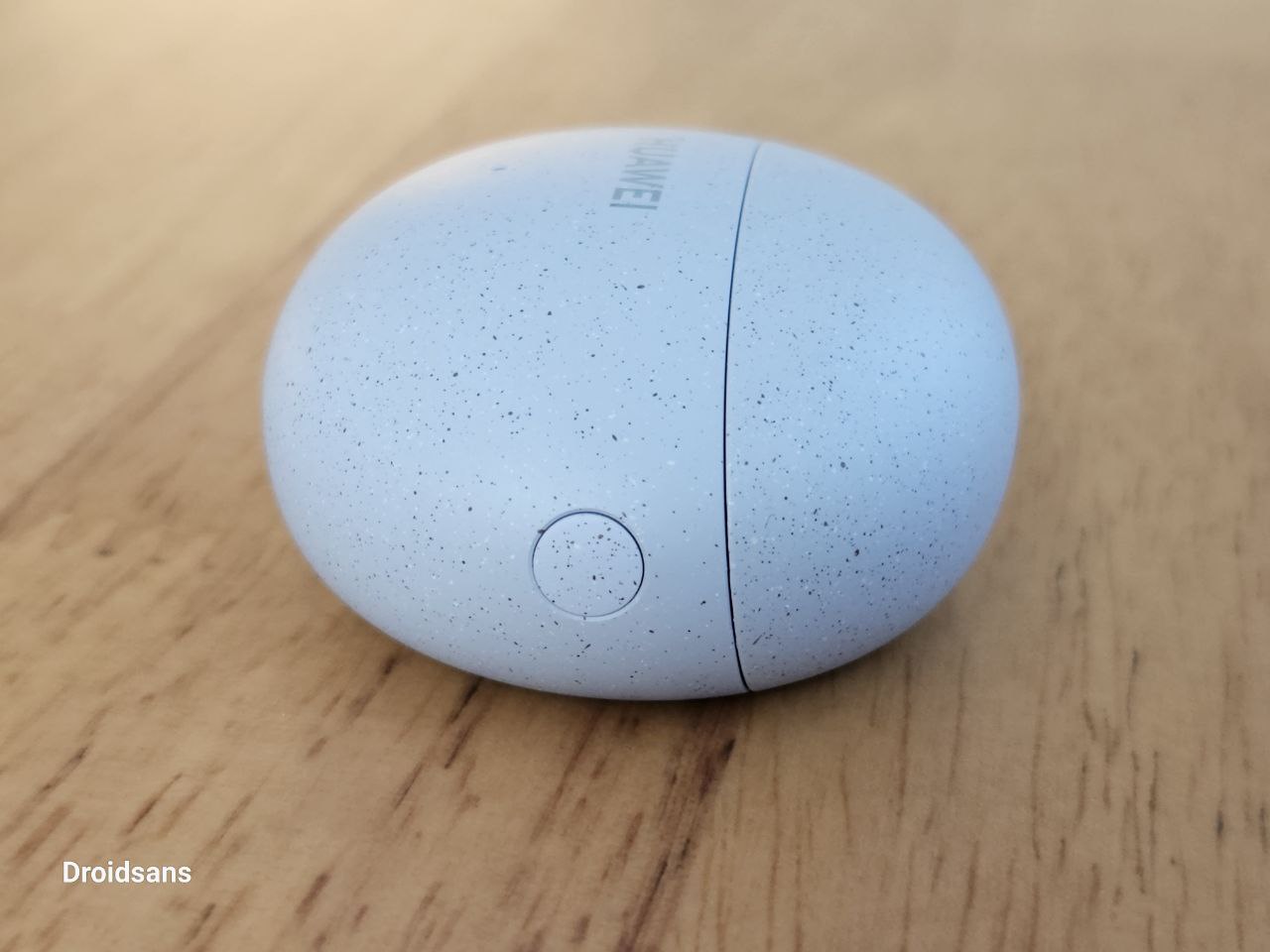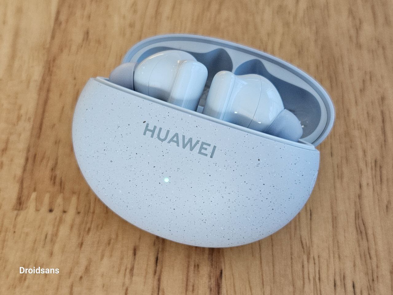 HUAWEI FreeBuds 5i ที่ได้มาเป็นรุ่นสีน้ำเงิน Isle Blue ตัวเคสชาร์จทรงก้อนหินกรวดโค้งมน ผิวสัมผัสด้าน มีลายจุดเล็ก ๆ คลุมรอบพื้นผิว ได้แรงบันดาลใจจากหินภูเขาไฟ ด้านหน้ามีไฟแสดงสถานะ ด้านขวาวางปุ่มเชื่อมต่อ Bluetooth และช่องชาร์จอยู่ด้านล่าง เป็นพอร์ต USB-C น้ำหนักแค่ 33.9 กรัม ขนาดใหญ่กำลังดี ใส่กระเป๋ากางเกงได้สบาย