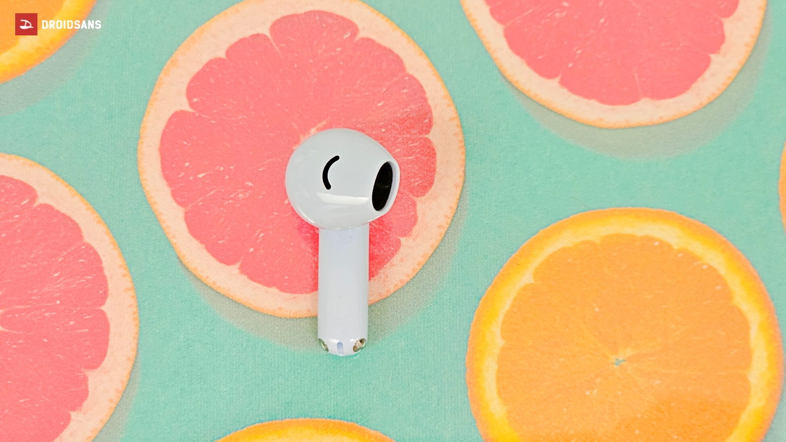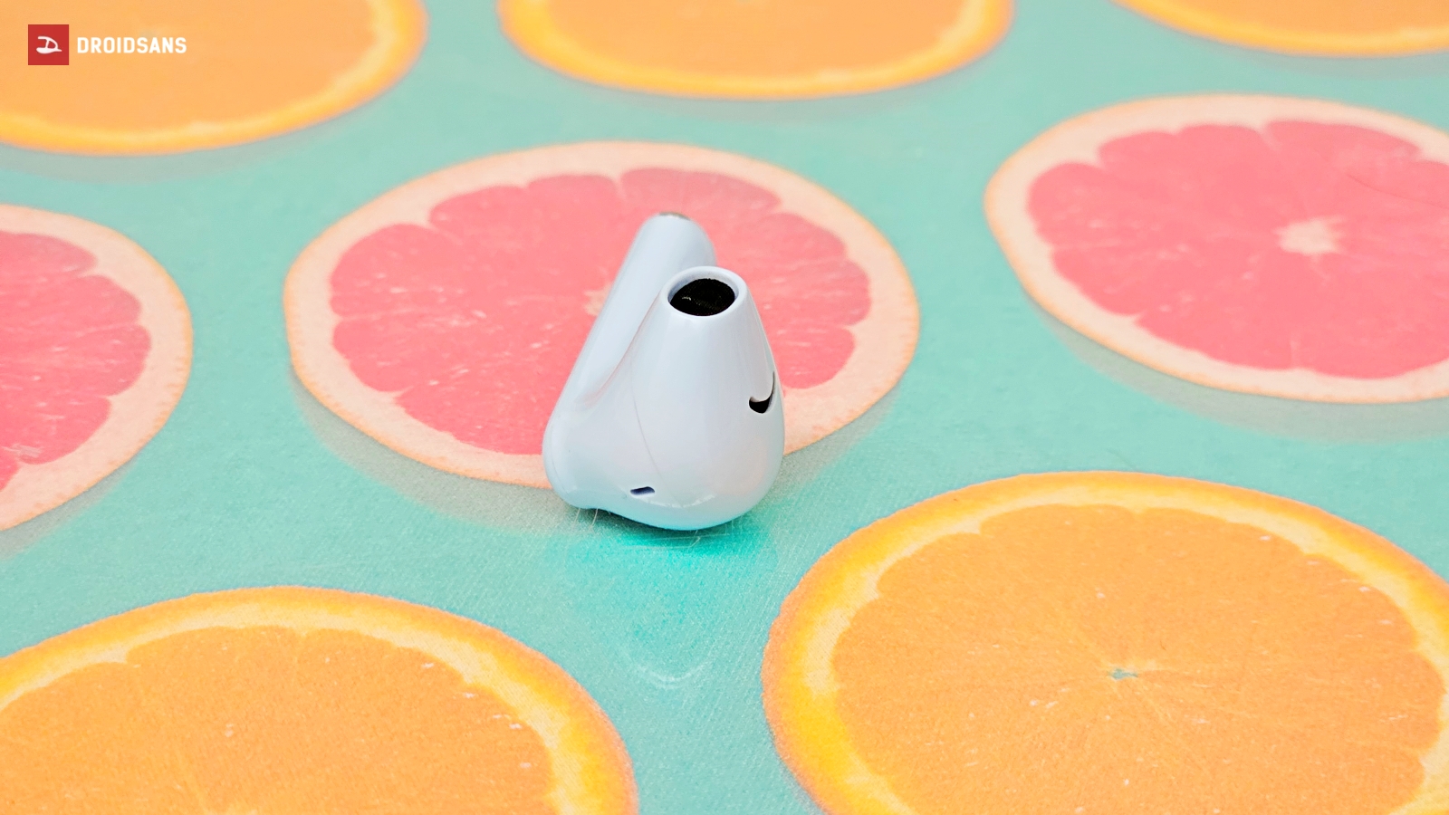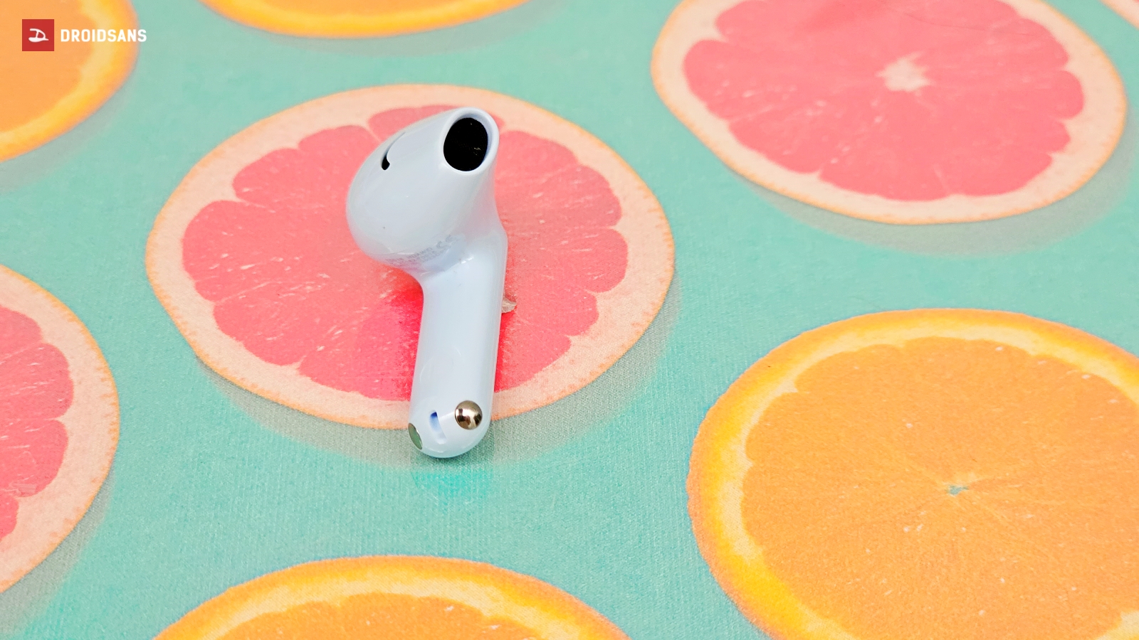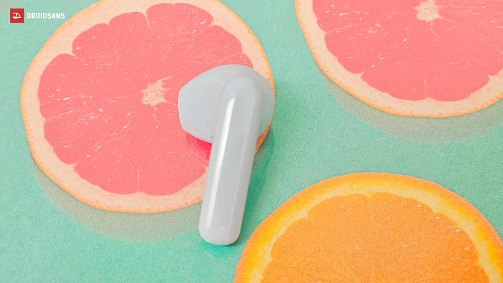 ส่วนตัวหูฟังนั้นมาในดีไซน์แบบ Earbuds เหมาะสำหรับคนที่ไม่ชอบหูฟังแบบจุก แถมยังออกแบบมาให้เข้ากับรูปหู ใส่วิ่ง ใส่ออกกำลังกายไม่หลุด แถมน้ำหนักเบาเพียงข้างละ 3.8 กรัม เท่านั้น ใส่นาน ๆ ทั้งวันแล้วไม่เจ็บ ตัวก้านหูฟังทั้งสองข้างมีส่วนที่เว้าลงไป เพื่อให้สัมผัสควบคุมได้สะดวก ด้านล่างหูฟังมาพร้อมไมโครโฟนได้ข้างละ 1 ตัว