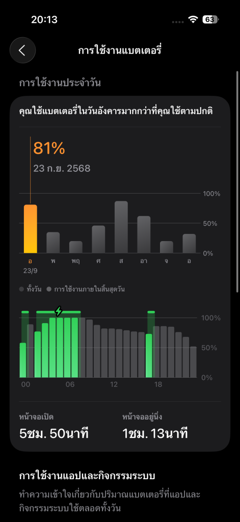iPhone 17 มาพร้อมแบตความจุ 3,692 mAh ที่ดูเหมือนจะน้อยนะครับ แต่การใช้งานจริงถือกว่าทำได้ดีครับ ได้ Screen On ประมาณ 5 ชม. 50 นาที ผมใช้เป็นเครื่องหลักเลย ใส่ซิมเปิด 5G เล่นโซเชียล เดินถ่ายรูป เล่นเกมทั่วไปเลยครับ แน่นอนว่าถ้าคุณใช้งานระหว่างวันยังไงก็เพียงพอ แต่ถ้าวันไหนไปเที่ยว ต้องถ่ายรูปเยอะๆ เล่นเกมหนักๆ ก็แนะนำให้พกเพาเวอร์แบงก์ซักตัว ไว้ชาร์จรอบนึง ก็เพียงพอที่จะเหลือรอดจนจบวันนะครับ