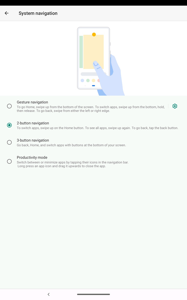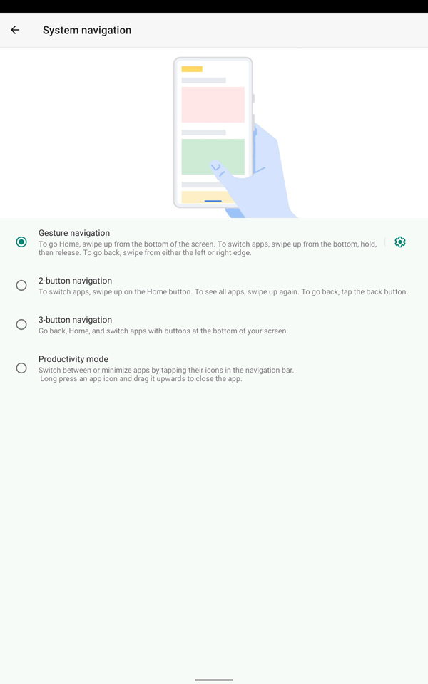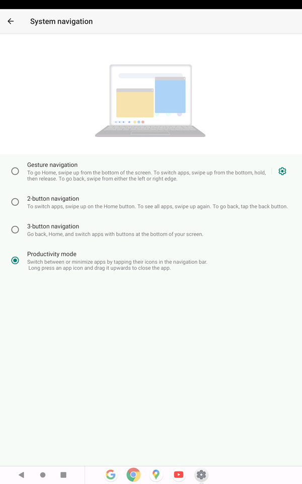 โหมดการทำงานหรือ Productivity mode เมื่อเปิดใช้งานจะมีด็อกปรากฏขึ้นมาบริเวณด้านล่างสุดของหน้าจอ เมนูการนำทางแบบ 3 ปุ่มจะถูกย้ายไปได้ที่บริเวณมุมด้านซ้าย แถบด็อกจะแสดงแอปทั้งหมดที่เราเปิดใช้งานอยู่ในปัจจุบัน และสามารถแตะค้างเพื่อเลื่อนสลับตำแหน่งได้ คล้ายกับทาสก์บาร์ของระบบปฏิบัติการ Windows แต่น่าเสียดายที่ไม่สามารถปักหมุดแอปที่ใช้งานบ่อย ๆ เอาไว้ได้