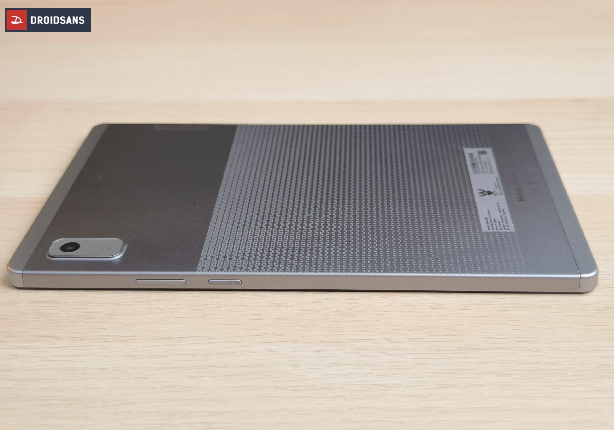 Lenovo Tab M9 บรรจุมาในกล่องแบบ Slip ภายในกล่องมีหัวชาร์จ สายชาร์จ และเข็มจิ้มซิม ไม่มีเคส และฟิล์มแถมมาให้ ส่วนตัวแท็บเล็ตซีลมาในซองกระดาษรักษ์โลก เมื่อเปิดออกมาจะพบกับตัวเครื่องดีไซน์เท่ งานประกอบดีเกินราคา ใช้วัสดุโลหะ มีการสกรีนพื้นผิวลายสามเหลี่ยมตัดกับสีเทาของตัวเครื่อง มีโมดูลกล้องหลังความละเอียด 8MP ยื่นออกมา