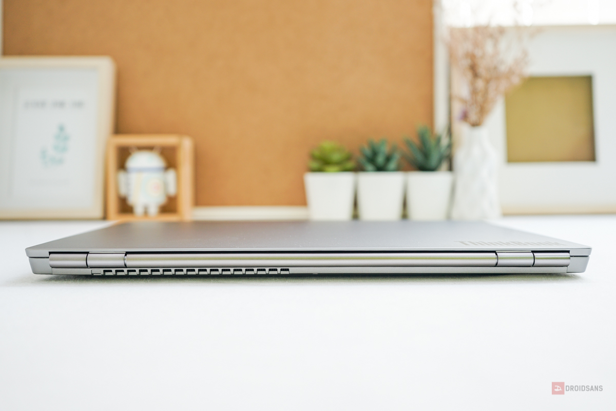 ไซต์ตัวเครื่องทำมาได้บางและเล็กมากด้วยหน้าจอไซต์ 13.3 นิ้ว ทำให้พกพาสะดวก มาพร้อมกับขอบจอบาง 3 ด้าน แกนฝาพับก็ใช้วัสดุเป็นโลหะผสมที่ใช้เทคโนโลยี Powdere-Metal กางได้ 180 องศา พร้อมผ่านการทดสอบเปิด-ปิดกว่า 25,000 รอบมั่นใจได้ว่าไม่พังง่ายๆ แน่นอน แถมยังผ่านการทดสอบน้ำหกบนคีย์บอร์ดได้ 60 มิลลิลิตรอีกด้วย เรื่องงานประกอบแน่นปึกไม่ต่างจากรุ่นพี่ที่เป็น ThinkPad เลย