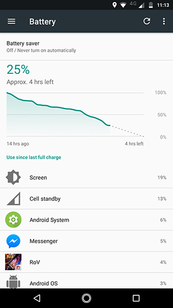 เท่าที่ลองเล่นมาซักพักก็ต้องบอกว่า แบตเตอรี่ความจุ 3,000 mAh ของ G5S Plus อยู่ในระดับที่ใช้ได้ อาจจะไม่ได้อึดขั้นเทพ แต่ก็สามารถใช้งานได้ตั้งแต่เช้ายันเย็น โดยการใช้งานของผมส่วนใหญ่แล้วก็จะหนักไปทางด้านการ เล่นแชท เล่นโซเชียลมีเดีย อ่านข่าว ฟังเพลง และ เล่น RoV ซึ่งผลลัพธ์ก็คือสามารถใช้งานหน้าจอได้ประมาณ 4 ชั่วโมงกว่า เล่น RoV ไปประมาณ 1 ชั่วโมง
