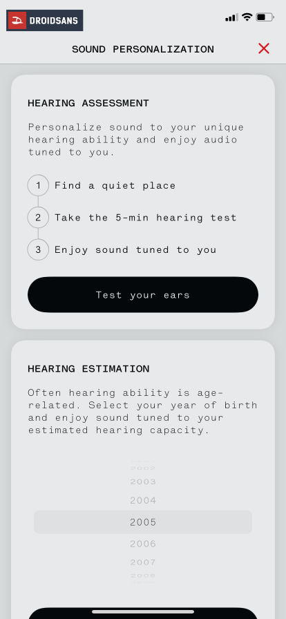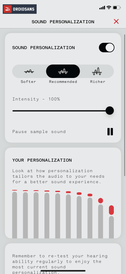 หากใครไม่ชอบสไตล์เสียงมาตรฐานที่โรงงานตั้งมา สามารถเข้าไปปรับ Equalizer ในแอป Nothing X ได้เอง นอกจากนี้แล้วตัวแอปยังมีระบบโปรไฟล์เสียงส่วนตัว Personal Sound Profile ที่ช่วยปรับค่าคลื่นความถี่เสียงต่าง ๆ ให้เข้ากับสไตล์การฟังของเรา ผ่านการทำเทสความสามารถในการฟัง และกดตามจังหวะคลื่นเสียงที่เราได้ยินโดยใช้เวลาไม่ถึง 5 นาทีเท่านั้น ซึ่งผลลัพธ์ก็ทำออกมาได้น่าทึ่งเลย