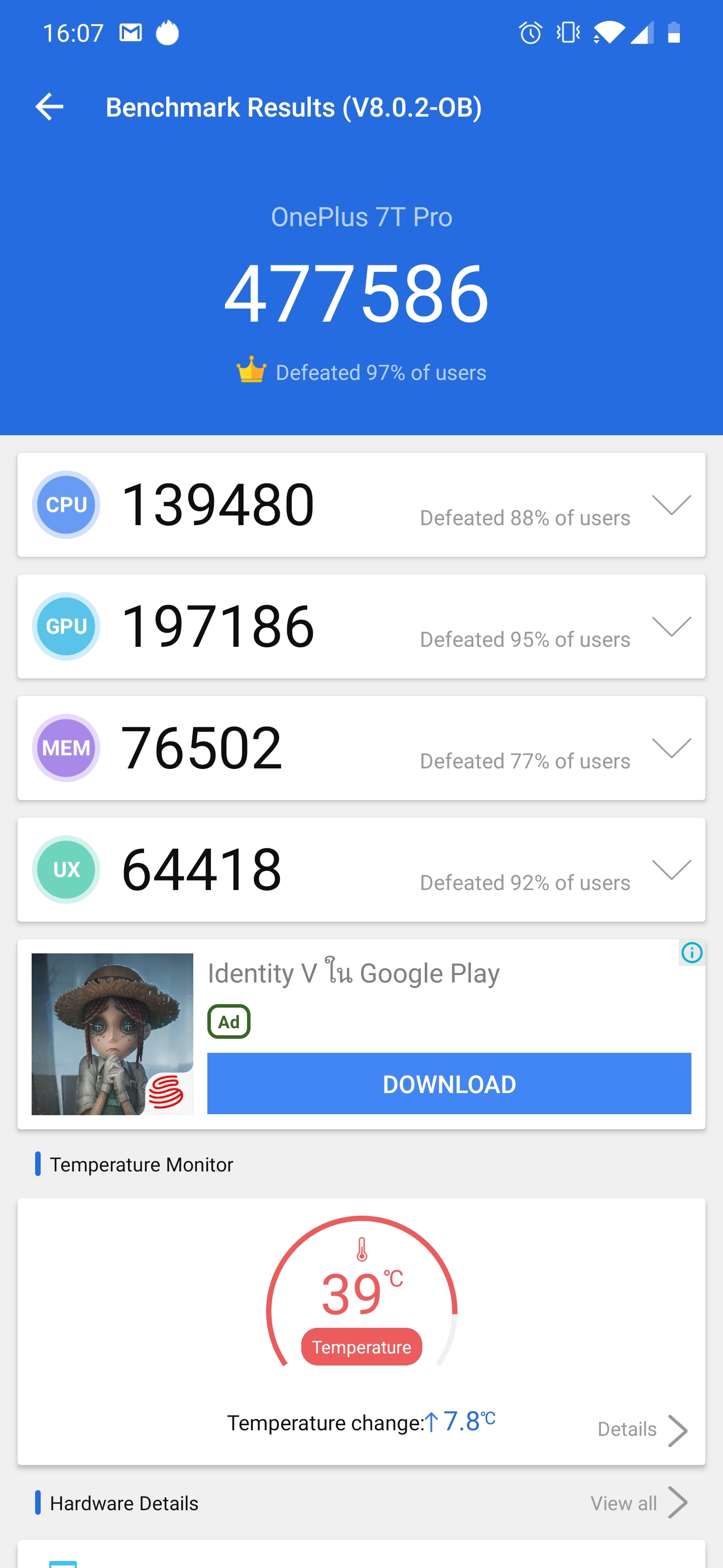 ชิปเซ็ตตัวแรงอย่าง Snapdragon 855+ แทบไม่ต้องบรรยายอะไรมากเลย การใช้งานทั่วไปหรือการเล่นเกมบอกเลยว่าเหลือสุดๆ เรียกได้ว่าสองรุ่นนี้ถือว่าเป็นตัวท็อปจากฝั่ง Android เลย หากใครยังไม่เชื่อ ก็ไปดูคะแนน AnTuTu Benchmark กันได้เลย OnePlus 7T ได้คะแนน 475,550 คะแนน และ OnePlus 7T Pro อยู่ที่ 477,586 คะแนน เรียกได้ว่าคะแนนห่างกันเพียงแค่เล็กน้อยเท่านั้น ใช้งานจริงแทบจะไม่แตกต่าง เครื่องนี้แรงยังไง อีกเครื่องก็แรงแบบนั้น