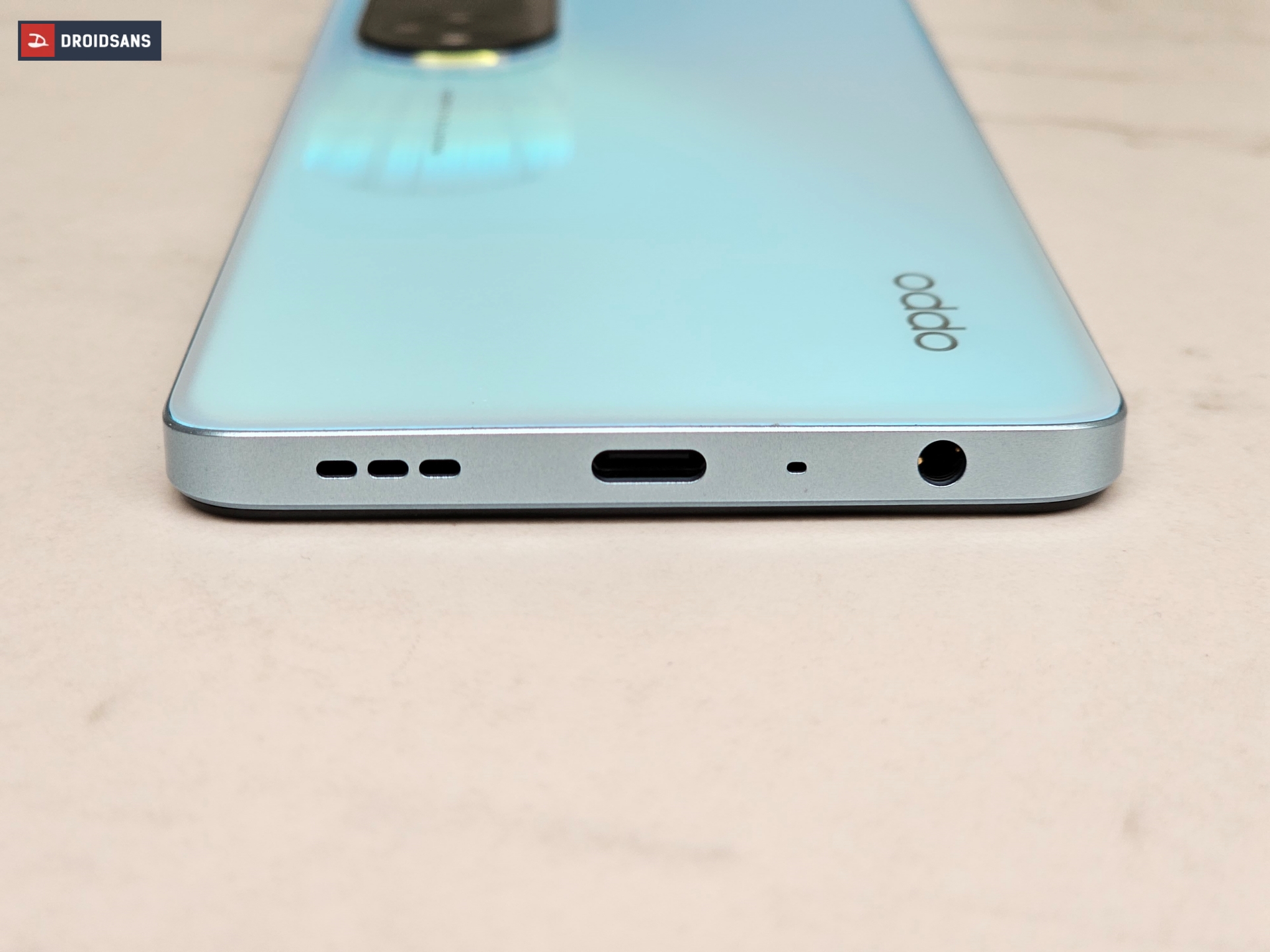 ขอบตัวเครื่องในรุ่นนี้มาในสีแบบด้าน ไม่ต้องกังวัลเรื่องลายนิ้วมือติด ฝั่งซ้ายจะมีปุ่ม เพิ่ม / ลดเสียง และช่องใส่ SIM แบบ Hybid Slot จะเลือกเพิ่มเป็น microSD Card หรือใส่ซิม 2 ก็ได้ ส่วนฝั่งขวามีปุ่ม Power ที่ฝังเซนเซอร์สแกนลายนิ้วมือไว้เพื่อใช้ปลดล็อกตัวเครื่อง ส่วนด้านบนตัวเครื่องมีเพียงรูไมโครโฟนตัดเสียงรบกวน ส่วนด้านล่างมีทั้งช่องเชื่อมต่อหูฟัง 3.5 มม. รูไมโครโฟนสนทนาหลัก พอร์ต USB-C และลำโพงคู่สเตอริโอ