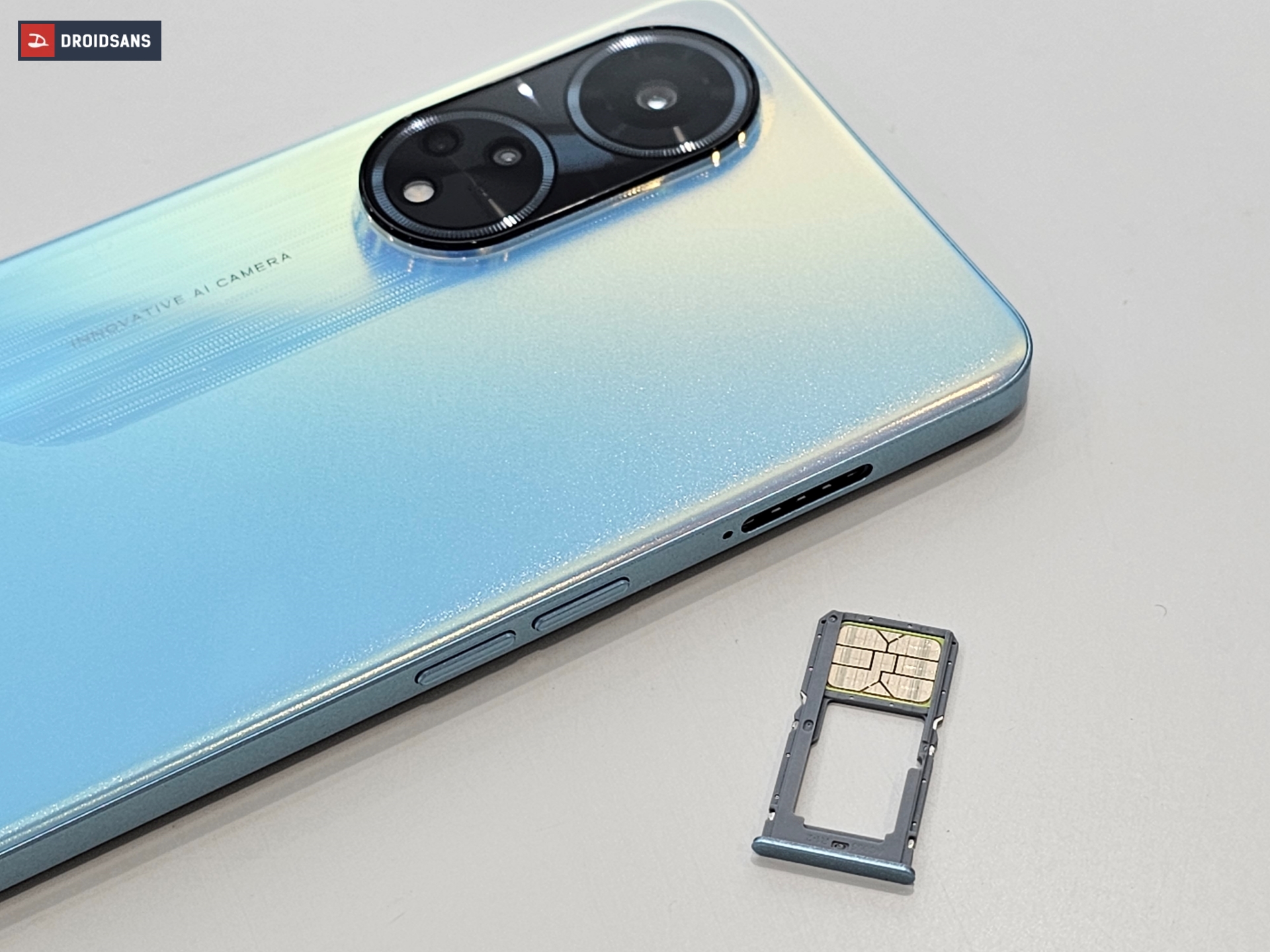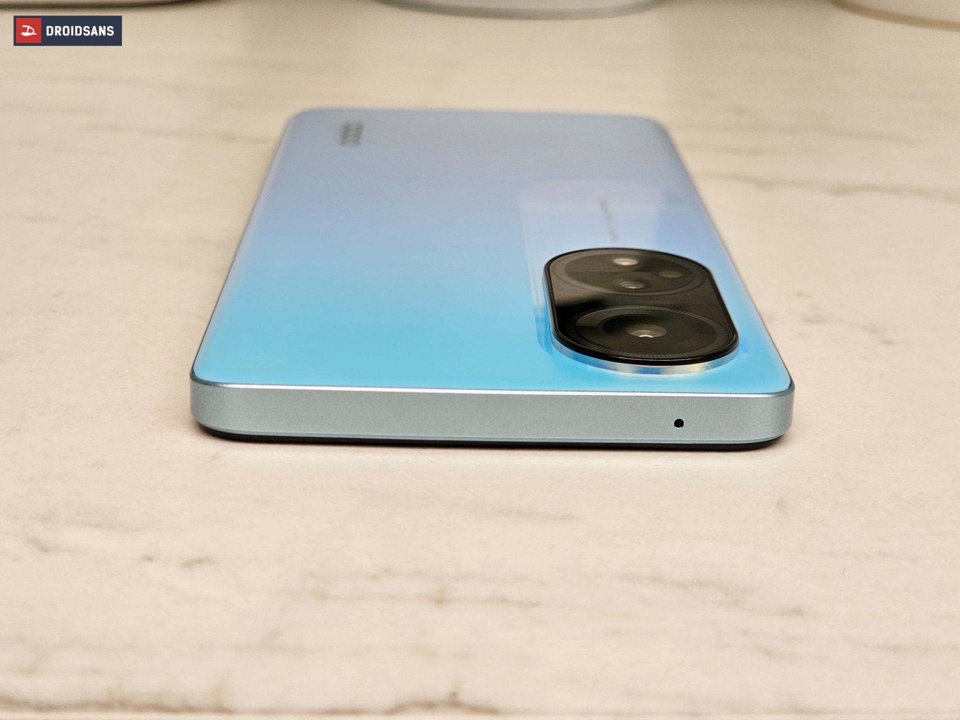 ขอบตัวเครื่องในรุ่นนี้มาในสีแบบด้าน ไม่ต้องกังวัลเรื่องลายนิ้วมือติด ฝั่งซ้ายจะมีปุ่ม เพิ่ม / ลดเสียง และช่องใส่ SIM แบบ Hybid Slot จะเลือกเพิ่มเป็น microSD Card หรือใส่ซิม 2 ก็ได้ ส่วนฝั่งขวามีปุ่ม Power ที่ฝังเซนเซอร์สแกนลายนิ้วมือไว้เพื่อใช้ปลดล็อกตัวเครื่อง ส่วนด้านบนตัวเครื่องมีเพียงรูไมโครโฟนตัดเสียงรบกวน ส่วนด้านล่างมีทั้งช่องเชื่อมต่อหูฟัง 3.5 มม. รูไมโครโฟนสนทนาหลัก พอร์ต USB-C และลำโพงคู่สเตอริโอ
