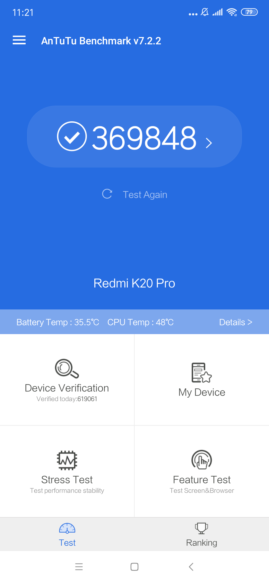 Redmi K20 Pro มาพร้อมกับชิปเซ็ต Snapdragon 855 ระดับท็อป พร้อม Ram 8 GB ใช้งานลื่นไหลทุกแอพ ตั้งแต่ใช้งานมายังไม่เจอค้างหรืออาการกระตุกให้กวนใจ และเรื่องของการทัชก็สามารถทำได้ติดมือไม่มีติดขัด ผลการทดสอบด้วย AnTuTu ได้คะแนนอยู่ที่ 369,848 คะแนน, ผลทดสอบ 3D Mark แบบ Slingshot Extreme OpenGL ได้ไป 5,060 คะแนน ส่วน Vulkan ได้ 4,232 คะแนน และ AndroBench ที่ใช้ความจุเป็น UFS 2.1 มีความเร็วในการอ่าน 857.75 MB/s และการเขียน 192.6 MB/s