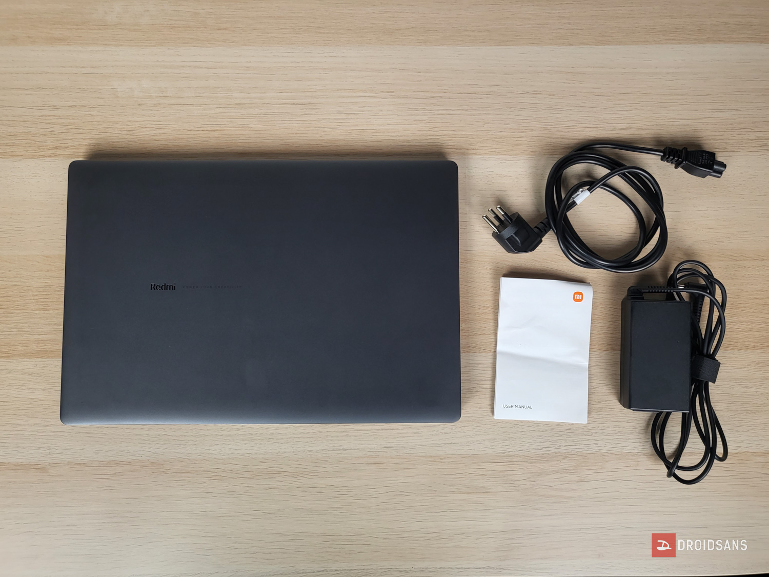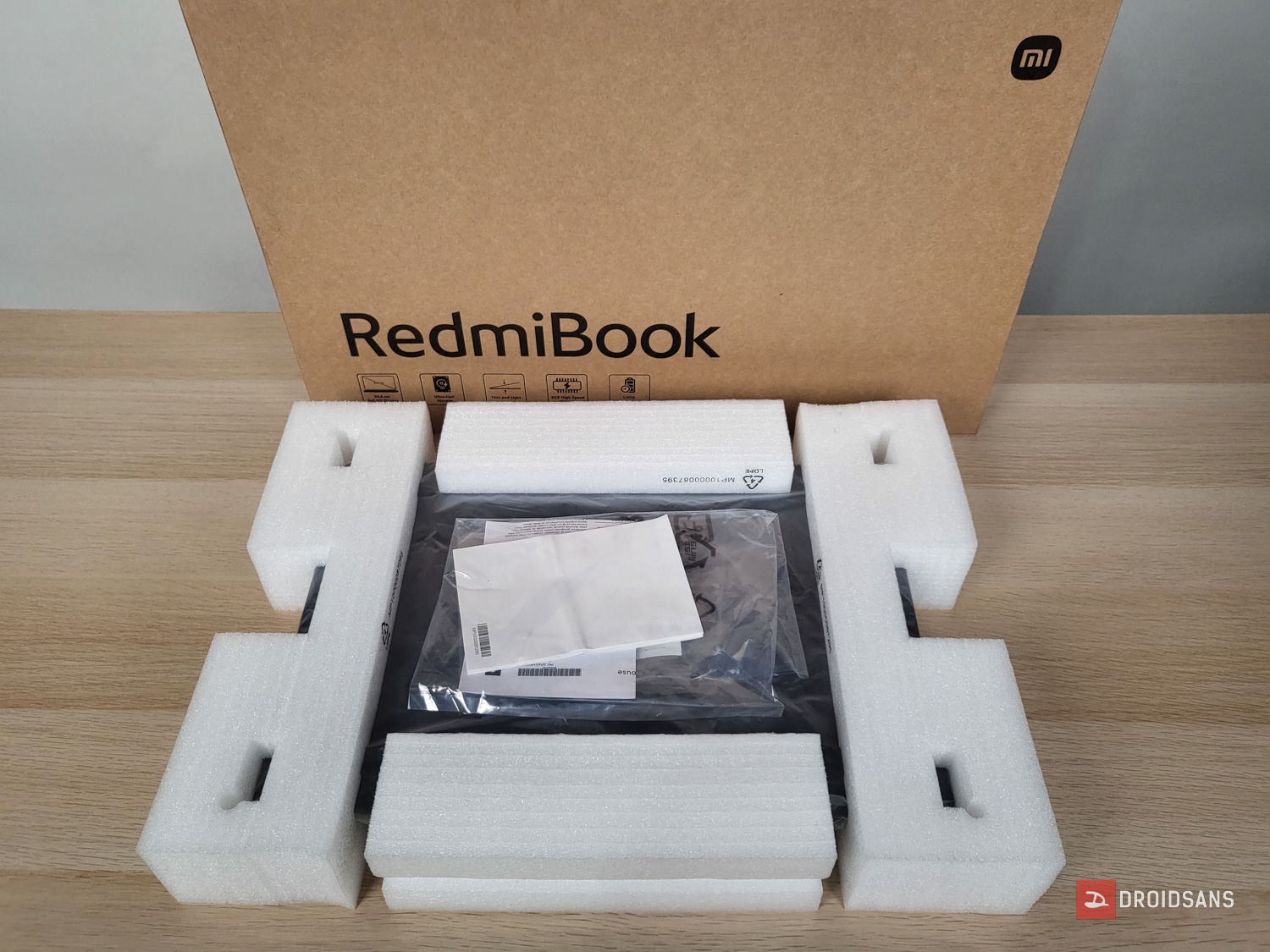 เปิดขึ้นมาแรกสุดก็จะเจอกับตัวเครื่องแพ็กไว้กับโฟมหนาอย่างดี มาพร้อมกับสายไฟเป็นปลั๊ก 3 ตา, อะแดปเตอร์ขนาด 65W และซองคู่มือ