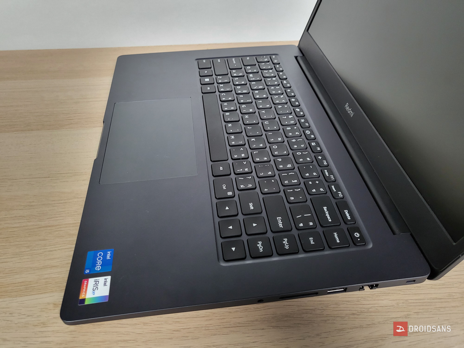 ด้านหน้าฝั่งหน้าจอจะใช้ขอบเป็นพลาสติกสีดำทึบคนละแบบกับบอดี้เครื่อง แอบมองว่าขอบยังค่อนข้างหนาไปหน่อยเทียบกับเทรนด์โน้ตบุ๊คปี 2022 ด้านบนสุดมีกล้องเว็บแคม 720p มาให้ พร้อมรูไมค์อีก 2 ช่องสำหรับใช้ประชุมออนไลน์ ด้านล่างสุดก็จะเป็นโลโก้ Redmi สกรีนสีขาว