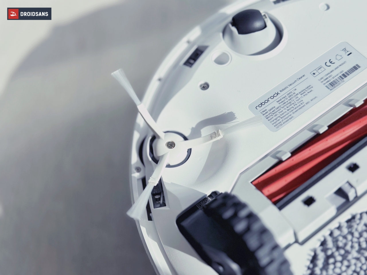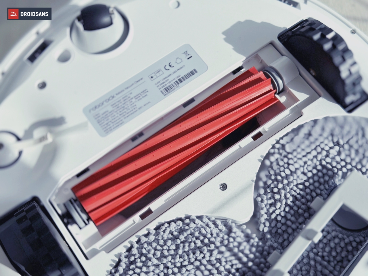 และเมื่อเปิดฝาด้านบนออกมาจะพบกับถังเก็บฝุ่น ที่สามารถถอดออกมาล้างน้ำได้ทุกชิ้น และมี QR Code ให้สแกนเพื่อเชื่อมต่อตัวเครื่องเพื่อสั่งการผ่านแอป Roborock และเมื่อพลิกหุ่นยนต์ลงมาดูด้านล่าง จะพบแปรงเก็บฝุ่นแบบยางขนาดใหญ่ และทนทานถอดออกมาล้างได้ แถมยังช่วยไม่ให้เศษผมมาพันกันยุ่งเหยิง ส่วนด้านบนจะมีแปรงปัดรองเพื่อช่วยกวาดฝุ่นอีกแรง และช่องสีดำ 2 ช่องด้านล่างคือทีเด็ด เป็นช่องใส่ผ้าม็อบแบบคู่ ที่มีมาให้ในรุ่นนี้เป็นครั้งแรกนั่นเอง
