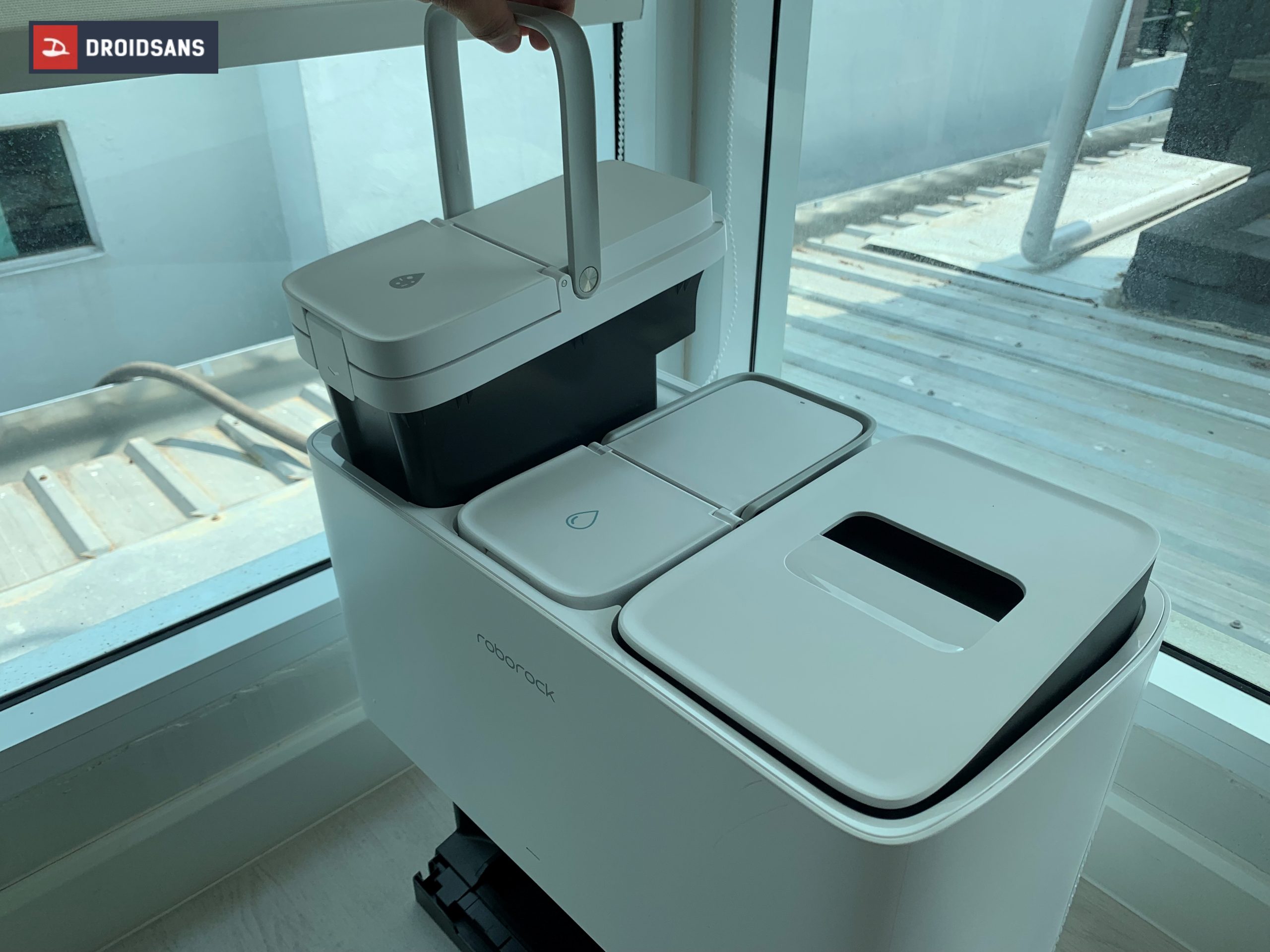Roborock S8 Pro Ultra มาในดีไซน์สุดเท่ สีขาวตัดดำ สถานีชาร์จมาพร้อมถังบรรจุน้ำเสีย / น้ำสะอาด / ถุงเก็บฝุ่น ที่ดีไซน์ออกมาได้ดูลงตัว มีสัญลักษณ์บอกชัดเจน ตัวถังเก็บน้ำมีหูจับในตัว สามารถดึงออกมาเพื่อเติมน้ำ หรือทำความสะอาดถังน้ำเสียได้อย่างง่ายดาย ในฝั่งของถังเก็บฝุ่น มีฝาปิดมิดชิด เมื่อเปิดออกมาจะเจอกับถุงเก็บฝุ่นใช้แล้วทิ้ง ไม่ต้องคอยทำความสะอาดให้เสียเวลา
