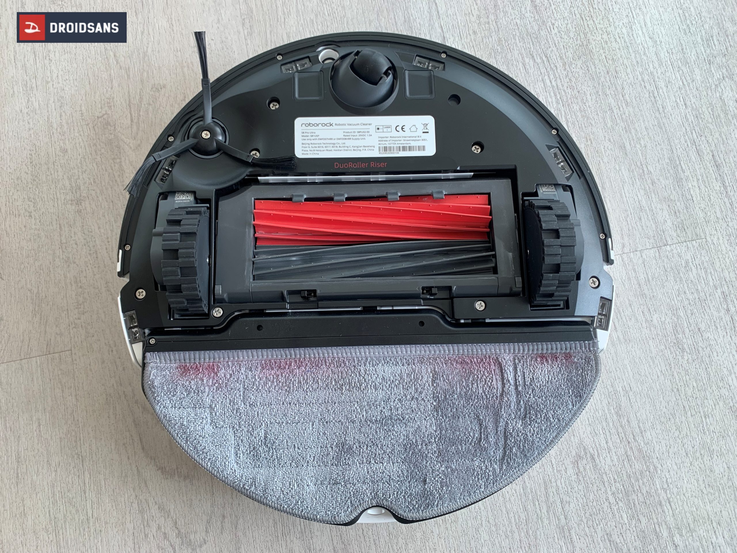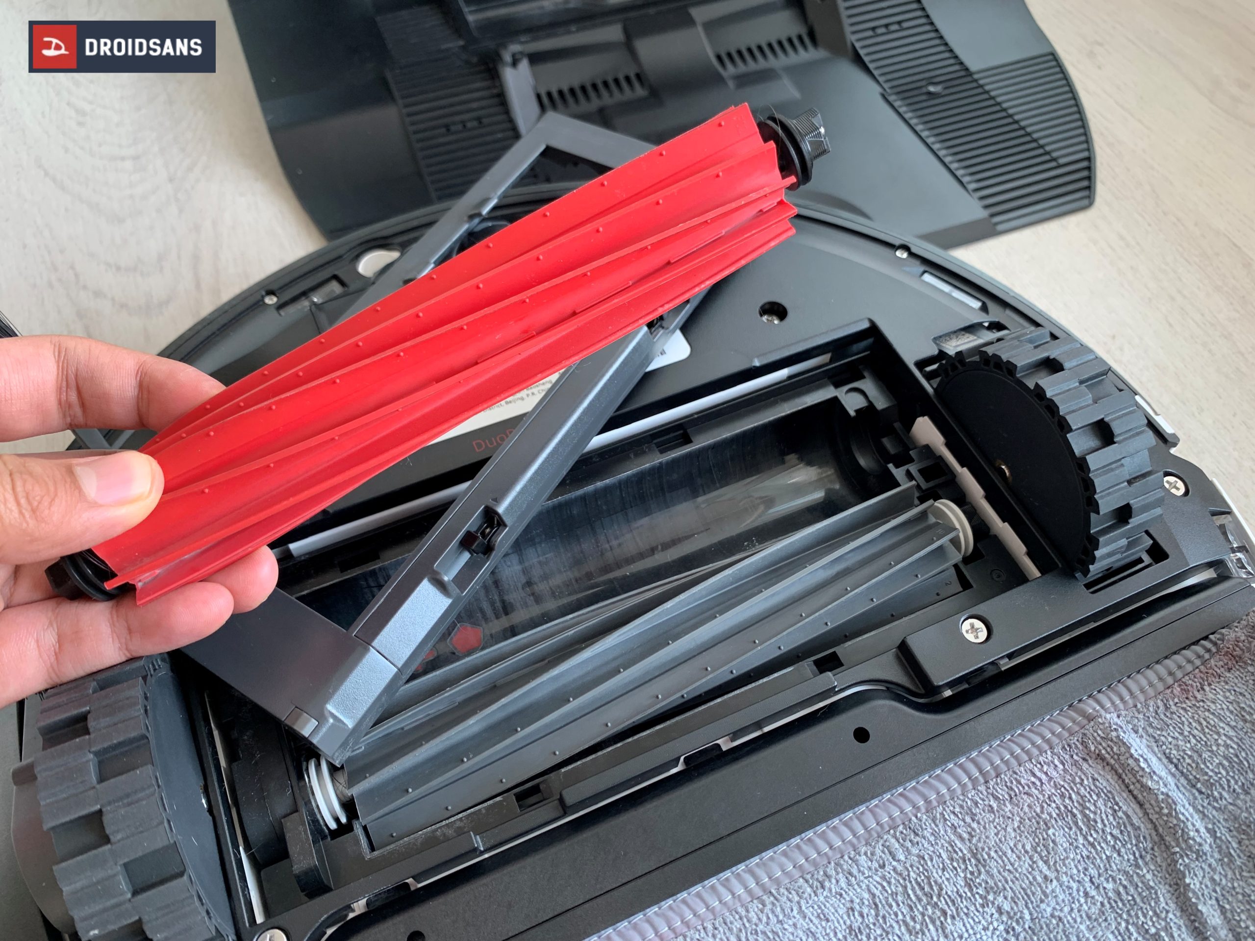 ด้านล่างของตัวโรบอต จะมาพร้อมแปรงเก็บฝุ่นขนาดใหญ่ 2 แปรง รวมถึงมีแปรงปัดข้าง Side Brush ติดตั้งมาให้เรียบร้อยแล้วตั้งแต่ในกล่อง มาพร้อมผ้าม็อบขนาดใหญ่กินพื้นที่ไปกว่าครึ่ง วันไหนที่เจองานใหญ่ก็ไม่ต้องกังวล เพราะทุกชิ้นที่เกี่ยวข้องกับการทำความสะอาดสามารถถอดออกมาล้างได้หมด หมดกังวลเรื่องความหมักหมมไปเลย