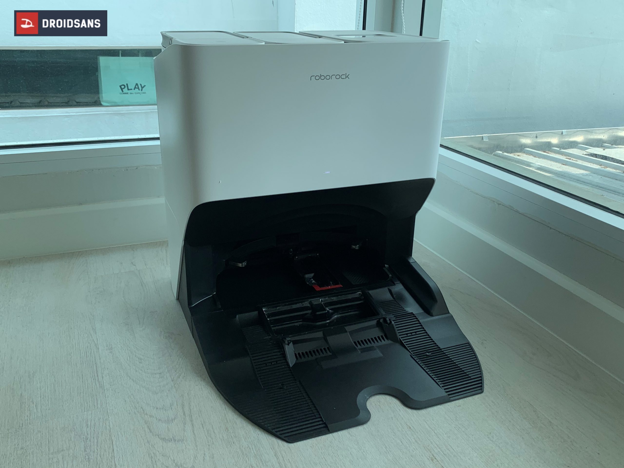 เมื่อทำการถูเสร็จแล้ว ตัวโรบอตจะวิ่งไปที่สถานีชาร์จเพื่อทำความสะอาดผ้าถูด้วยตนเอง และหากสังเกตดี ๆ ที่ฐานชาร์จจะมีแปรงเล็ก ๆ ที่จะช่วยซักผ้าถูให้เรา เมื่อซักเสร็จแล้วตัวฐานชาร์จก็จะทำความสะอาดด้วยตนเอง พร้อมดูดน้ำสกปรกไปไว้ในถังให้เลย ส่วนผ้าม็อบมีระบบเป่าแห้งด้วยลมร้อน จึงไม่ต้องกังวลเรื่องกลิ่นอับชื้น เรามีหน้าที่แค่ทิ้งน้ำเสีย นอกนั้น Roborock S8 Pro Ultra จัดการให้เราหมดแล้ว