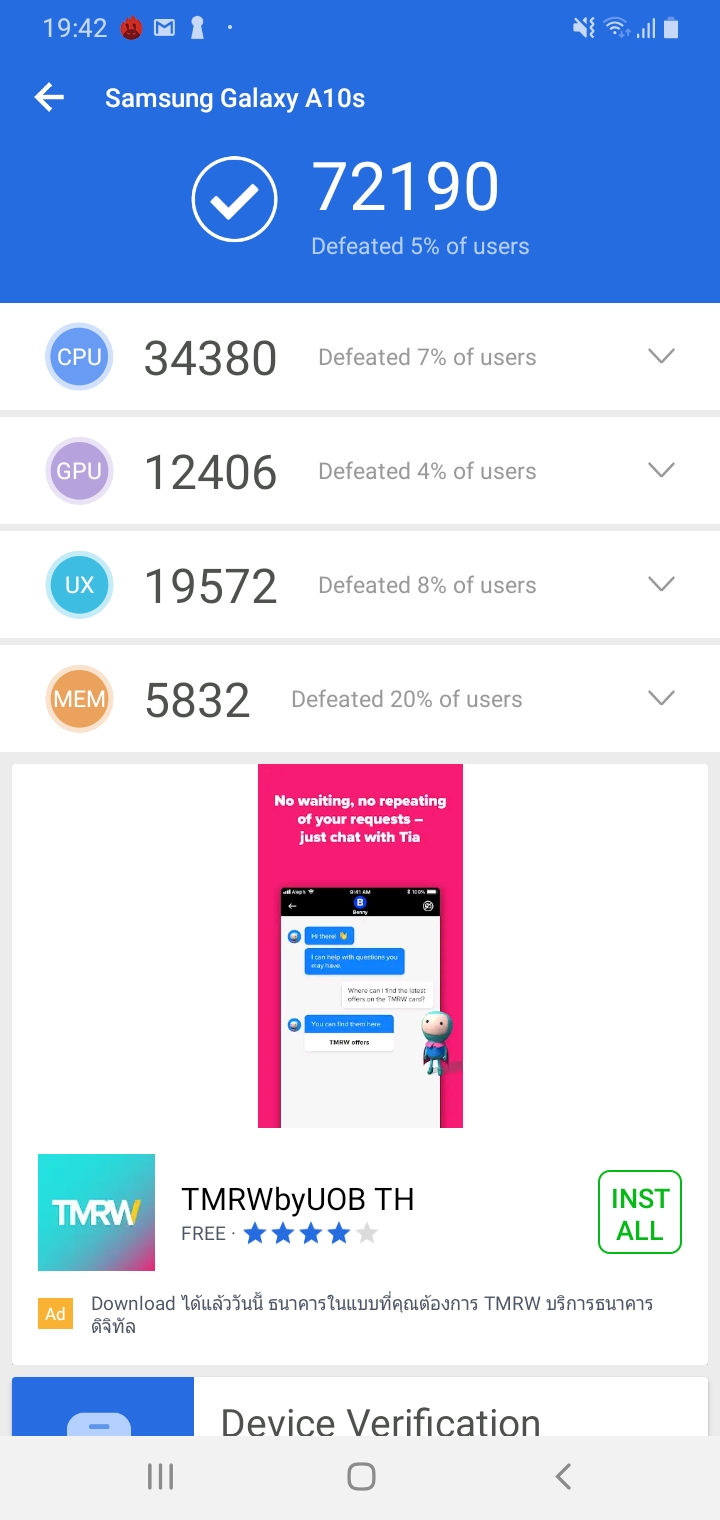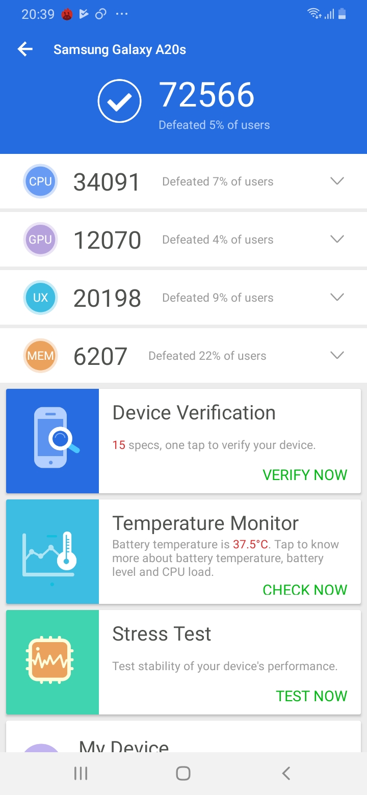 Galaxy A10s และ Galaxy A20s เลือกใช้ชิปเซ็ตเป็นตัว Helio P22 และ Snapdragon 450 ตามลำดับ เรื่องประสิทธิภาพการเล่นเกมอาจจะลำบากหน่อยถ้ามาเล่นบนเครื่องสองรุ่นนี้ แต่ก็แลกมาด้วยแบตเตอรี่ที่อึดนะ จากที่ลองเอาไปทดสอบค่า Benchmark กับแอป AnTuTu พบว่าทั้งคู่ทำคะแนนออกมาได้แบบไล่เลี่ยสูสีกันเลย โดย Galaxy A10s ทำคะแนนไป 72,190 คะแนน และ Galaxy A20s ที่ 72,566 คะแนน เรียกได้ว่าต่างกันเพียงแค่นิดเดียวเท่านั้น