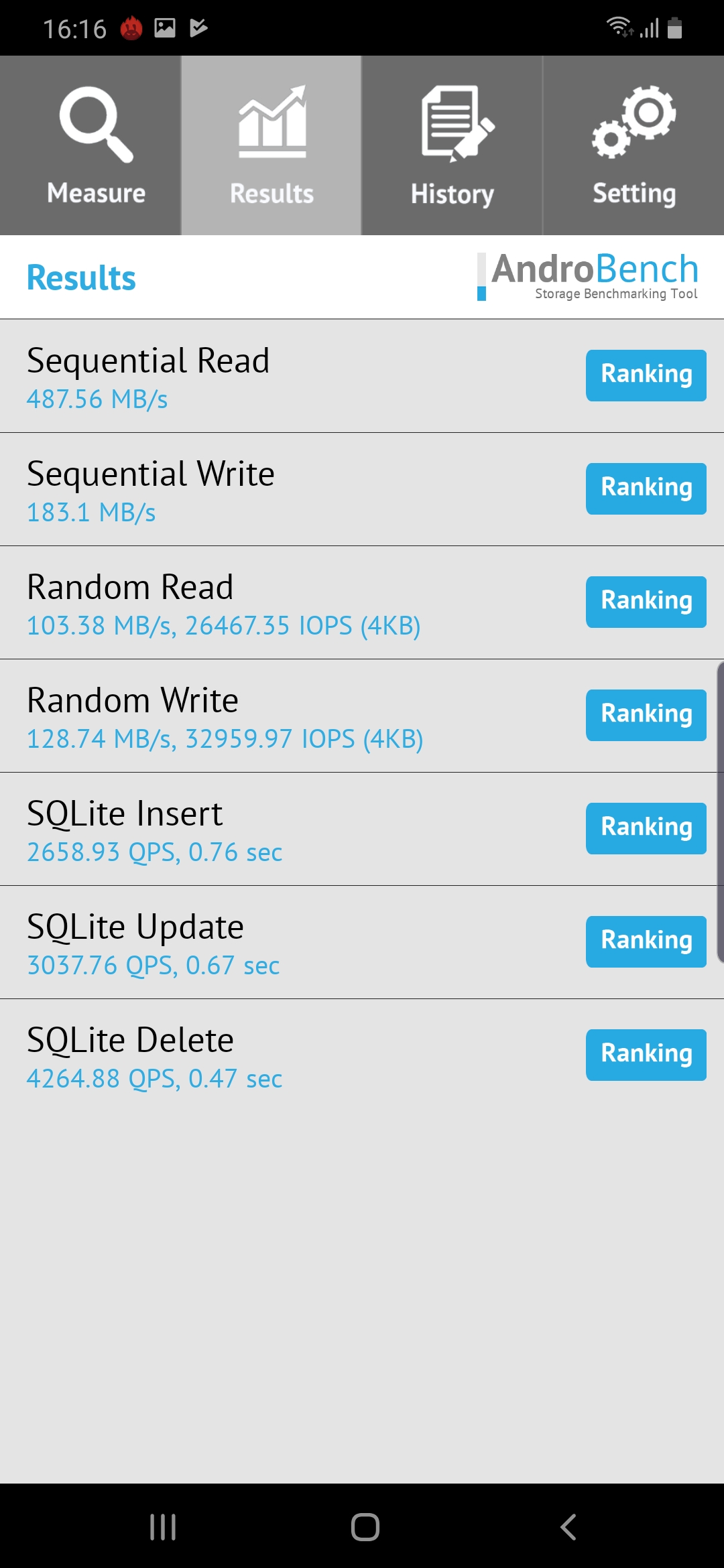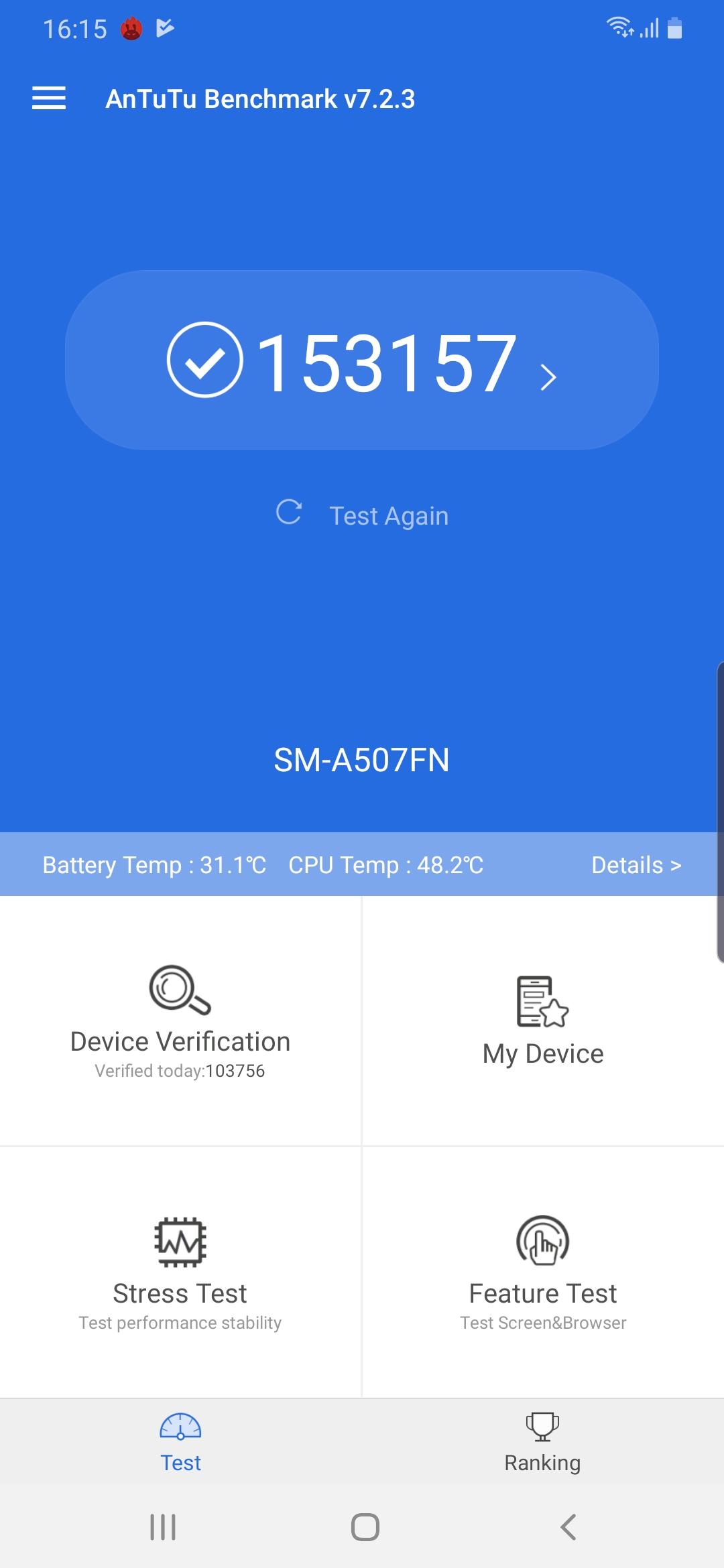 Galaxy A50s มาพร้อมกับชิปเซ็ต Exynos 9611 ระดับกลางค่อนบน พร้อม Ram 6 GB ผลการทดสอบด้วย AnTuTu ได้คะแนนอยู่ที่ 153,157 คะแนน ส่วน ROM นั้นใช้เป็นตัว UFS 2.1 ทดสอบออกมาแล้วมีความเร็วในการอ่าน 487.56 MB/s และการเขียน 183.1 MB/s