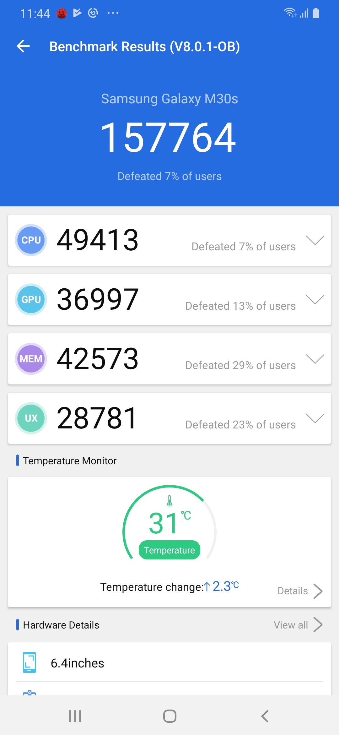 Galaxy M30s เลือกใช้ชิปเซ็ตเป็น Exynos 9611 ซึ่งประสิทธิภาพการใช้งานทั่วไปหรือแม้กระทั่งการเล่นเกมบอกเลยว่าหายห่วง เล่นได้แบบไม่มีกระตุก แถมลื่นไหลอีกต่างหาก เอาไปทดสอบกับแอป AuTuTu Benchmark มา ก็กวาดคะแนนไป 157,764 คะแนน