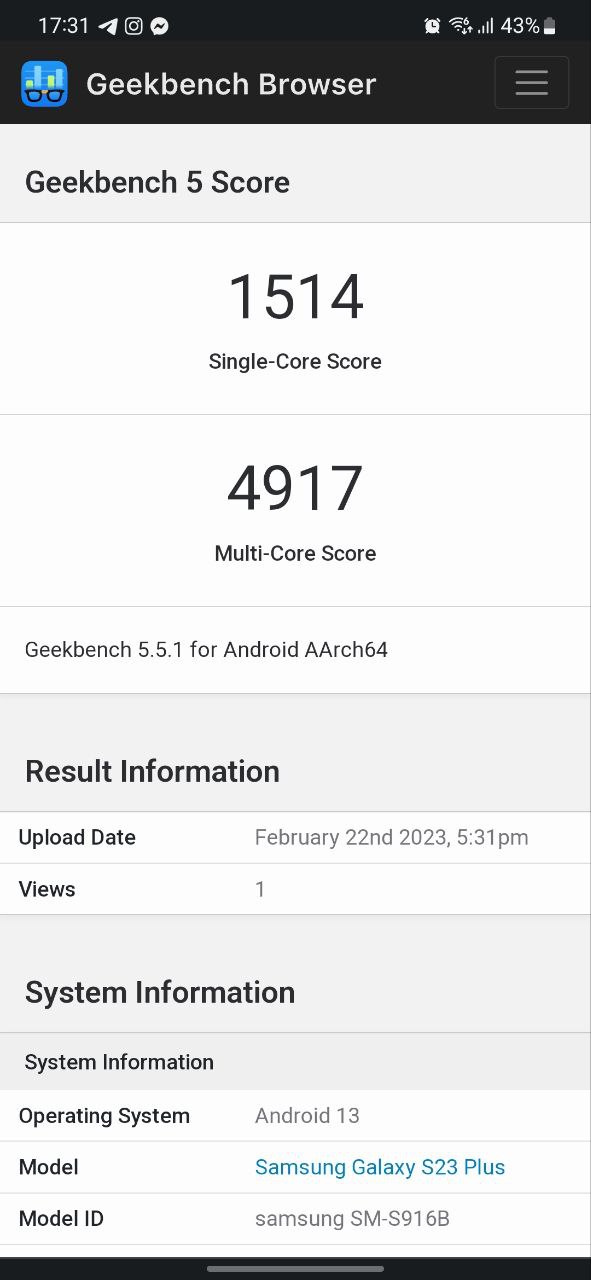 Samsung Galaxy S23+ คะแนนทดสอบ Geekbench 5 ได้ไป 1514/4917 และถ้าเป็น Geekbench 6 จะคะแนนสูงขึ้นมาเป็น 1870/4924