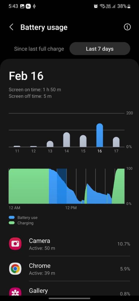แบตเตอรี่รุ่นนี้ Samsung เคลมว่าอยู่ได้ยาวนานกว่า Galaxy S23 Ultra เนื่องจากมีแบตขนาดใหญ่และมีสเปคต่าง ๆ ที่ไม่เยอะเท่ารุ่นท็อป ก็จะเป็นตัวเลือกสำหรับคนที่ต้องการมือถือแบตอึด อยู่ได้นานทั้งวัน ซึ่งในการใช้งานมือถือตามปกติ ปล่อยหน้าจอให้ปรับความสว่างเอง และใช้รีเฟรชเรทแบบ Adaptive การเคลื่อนไหวสูงสุด 120Hz ทดลองแล้วได้ผลตามนี้