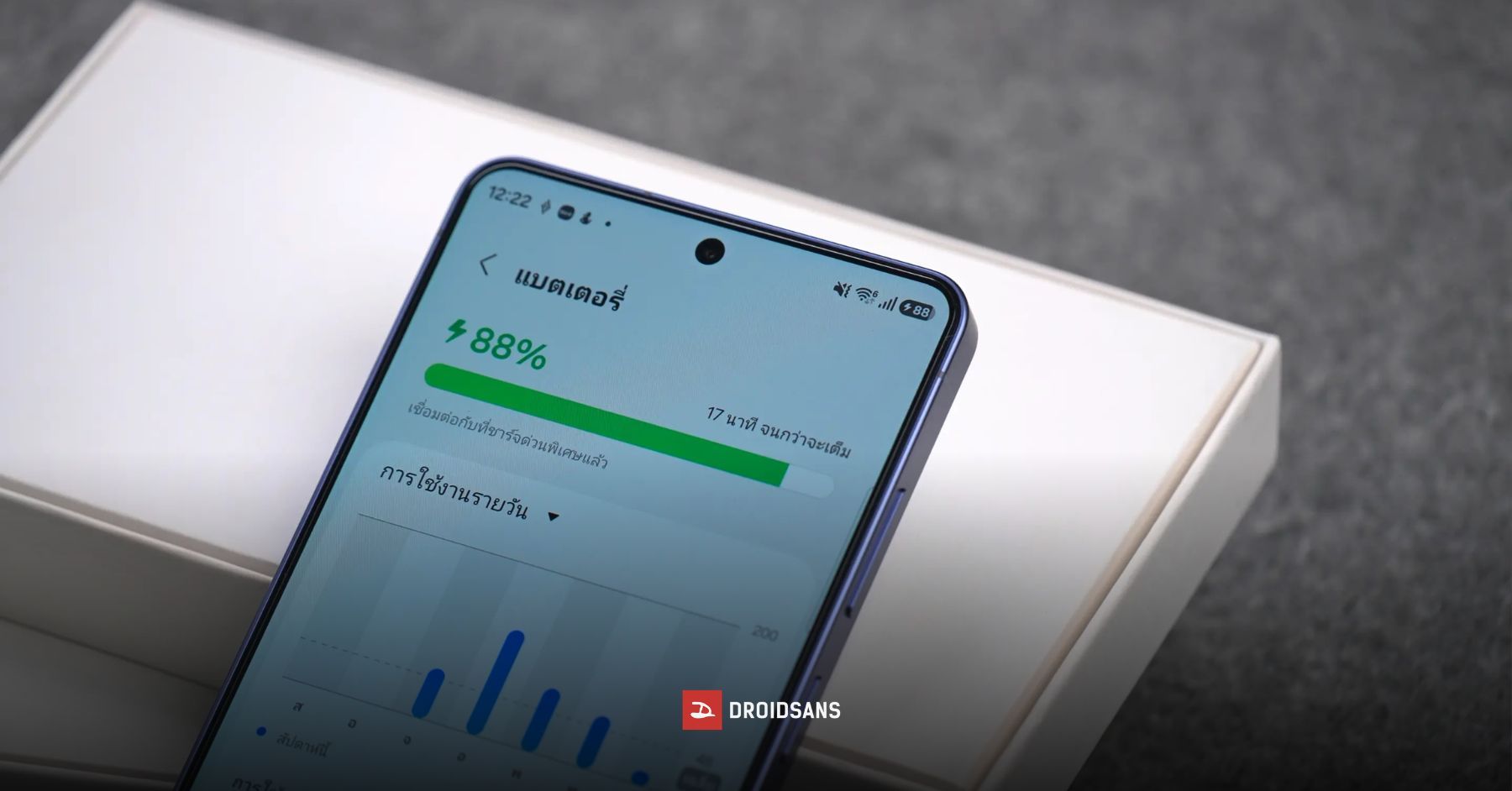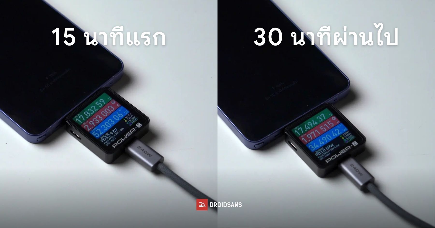 จากการทดสอบของทีมงาน DroidSans ได้ใช้เป็นหัวชาร์จมาตรฐาน PD3.0 ในช่วง 15 นาทีแรกได้แบตเตอรี่กลับมา 45% ด้วยกำลังไฟเฉลี่ยประมาณ 51W จากนั้นเมื่อชาร์จจนครบ 30 นาที กำลังไฟก็ค่อย ๆ ลดระดับลงมาจนเหลือเพียง 34W