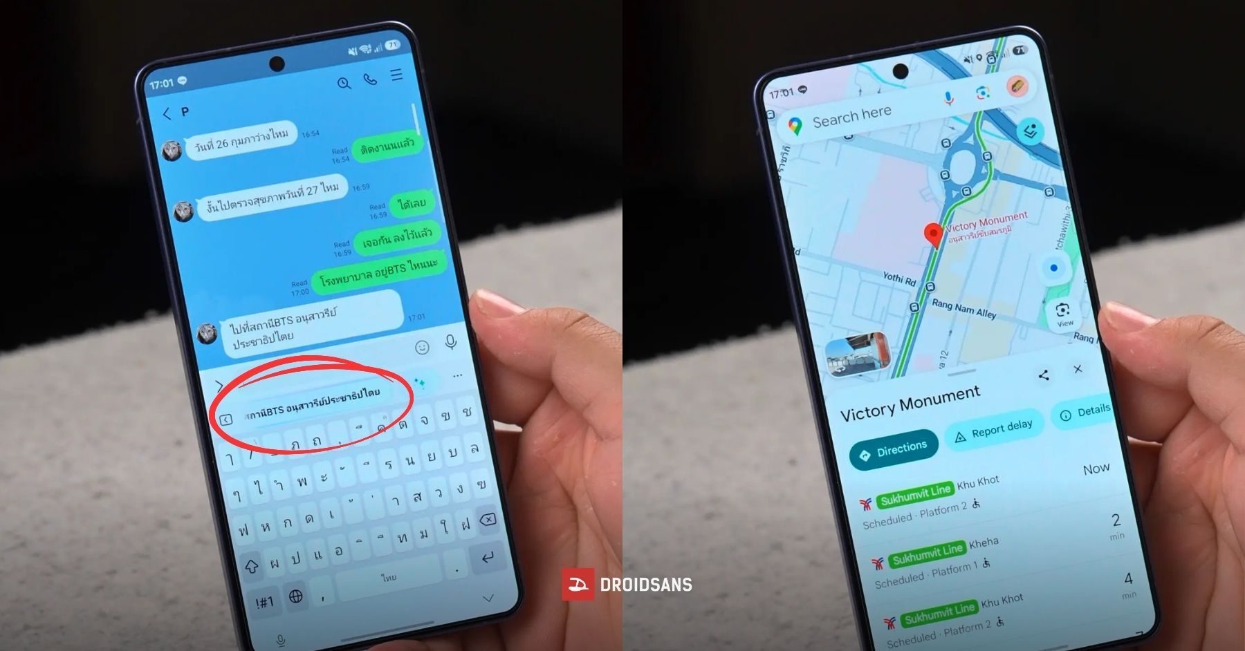 กรณีต่อมาคือ ‘เพื่อนส่งแค่ชื่อของสถานที่มาให้’ จากเดิมที่เราจะต้องกด Copy หรือจำข้อความนั้น ๆ แล้วสลับไปเสิร์ชด้วยตนเองบน Maps ต่อจากนี้เมื่อในห้องแชท Now Nudge ตรวจเจอข้อความซึ่งเป็นชื่อสถานที่ส่งมาเมื่อไหร่ ระบบจะขึ้น Shortcut ให้เรากดดูเส้นทางบน Maps ทันที