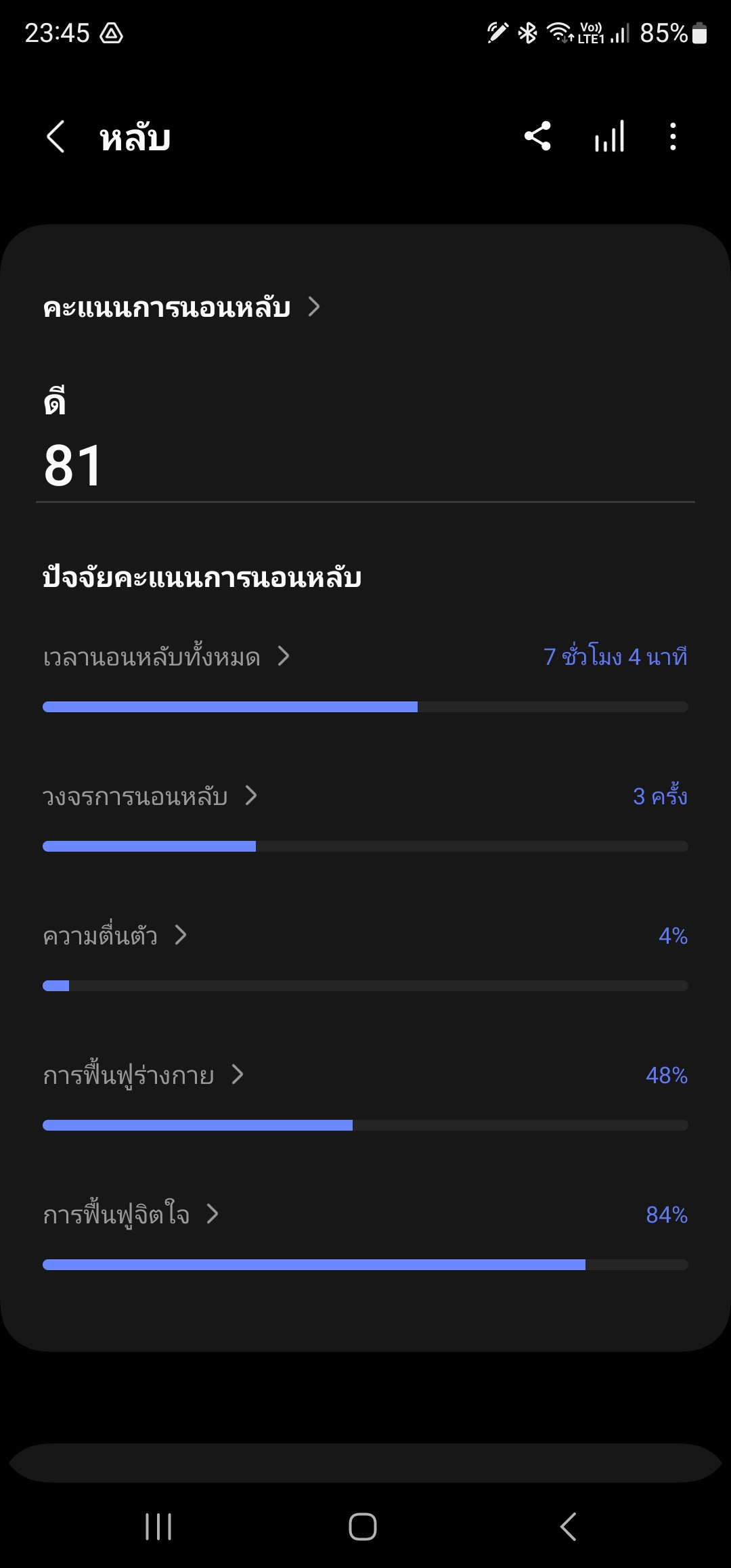 แต่ต้องบอกก่อนว่าข้อมูลในตัวนาฬิกาจะไม่ละเอียดเท่าบนมือถือนะคะ ยังไงก็ดีให้ Sync มาดูบนแอป Samsung Health จะได้ข้อมูลที่ครบถ้วนกว่าด้วย
