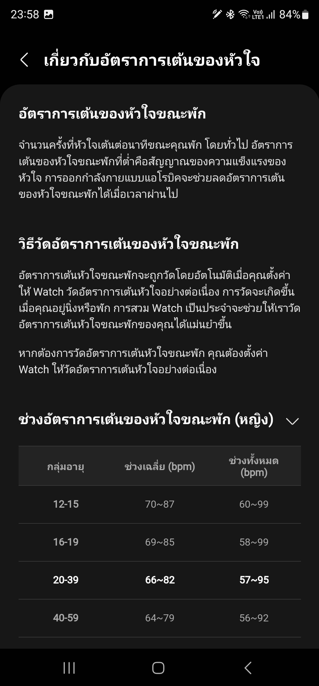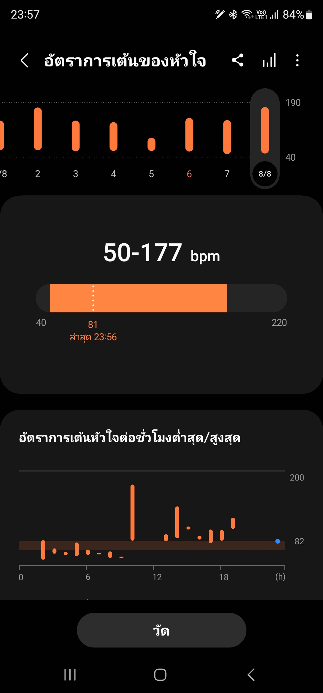 ตรวจอัตราการเต้นของหัวใจ เป็นการแสดงผลอัตราการเต้นหัวใจของเราอยู่ที่ 81 ครั้งต่อนาที ซึ่งเป็นค่าเฉลี่ยปกติสำหรับการพัก เหมาะกับคนที่ต้องการตรวจสอบการเต้นของหัวใจเป็นพิเศษ ก็สามารถเปลี่ยนการตั้งค่าเป็น Always ได้ เพื่อให้มีการตรวจจับอัตราการเต้นหัวใจอย่างต่อเนื่อง แต่ก็จะส่งผลกับอายุการใช้งานเครื่องในแต่ละวันด้วย
