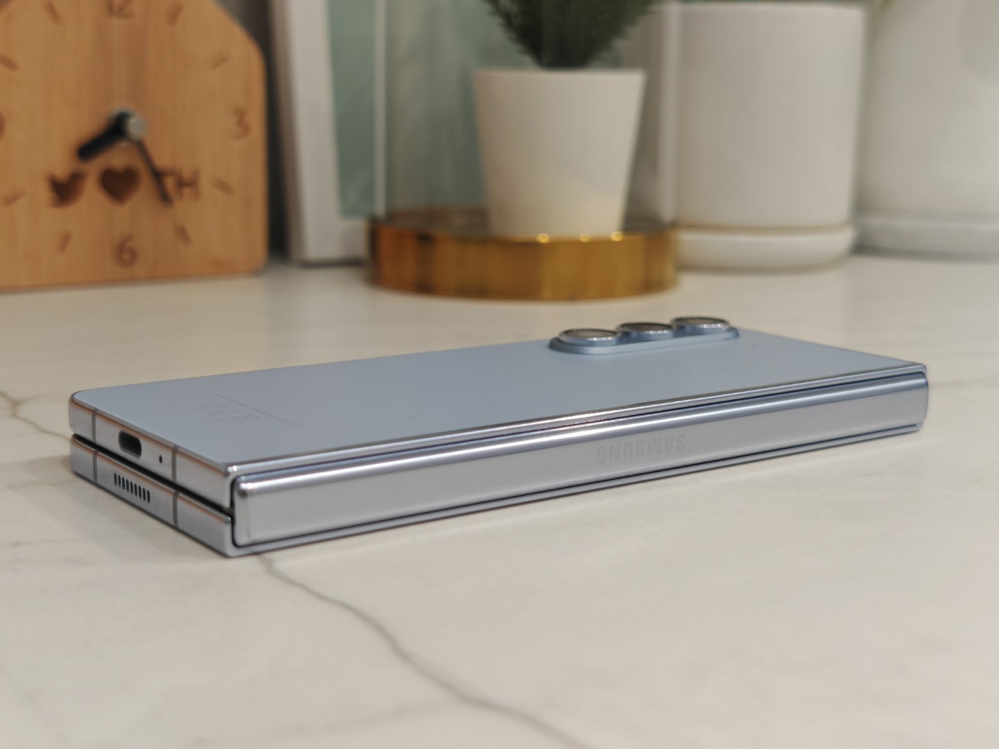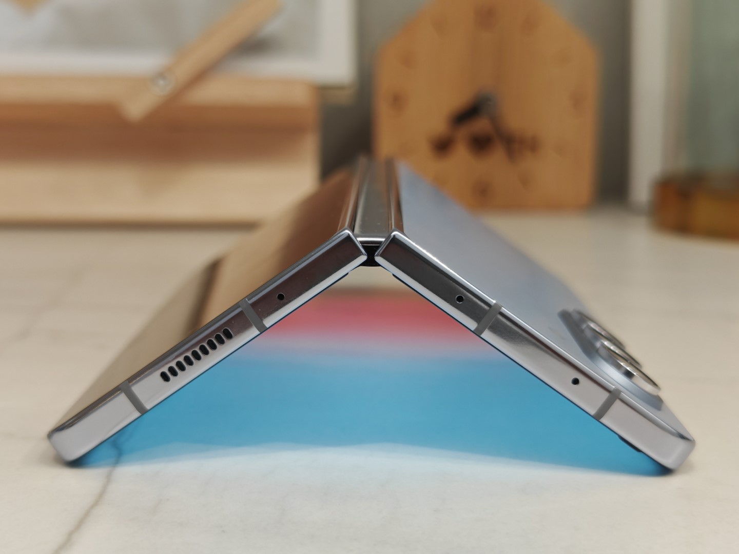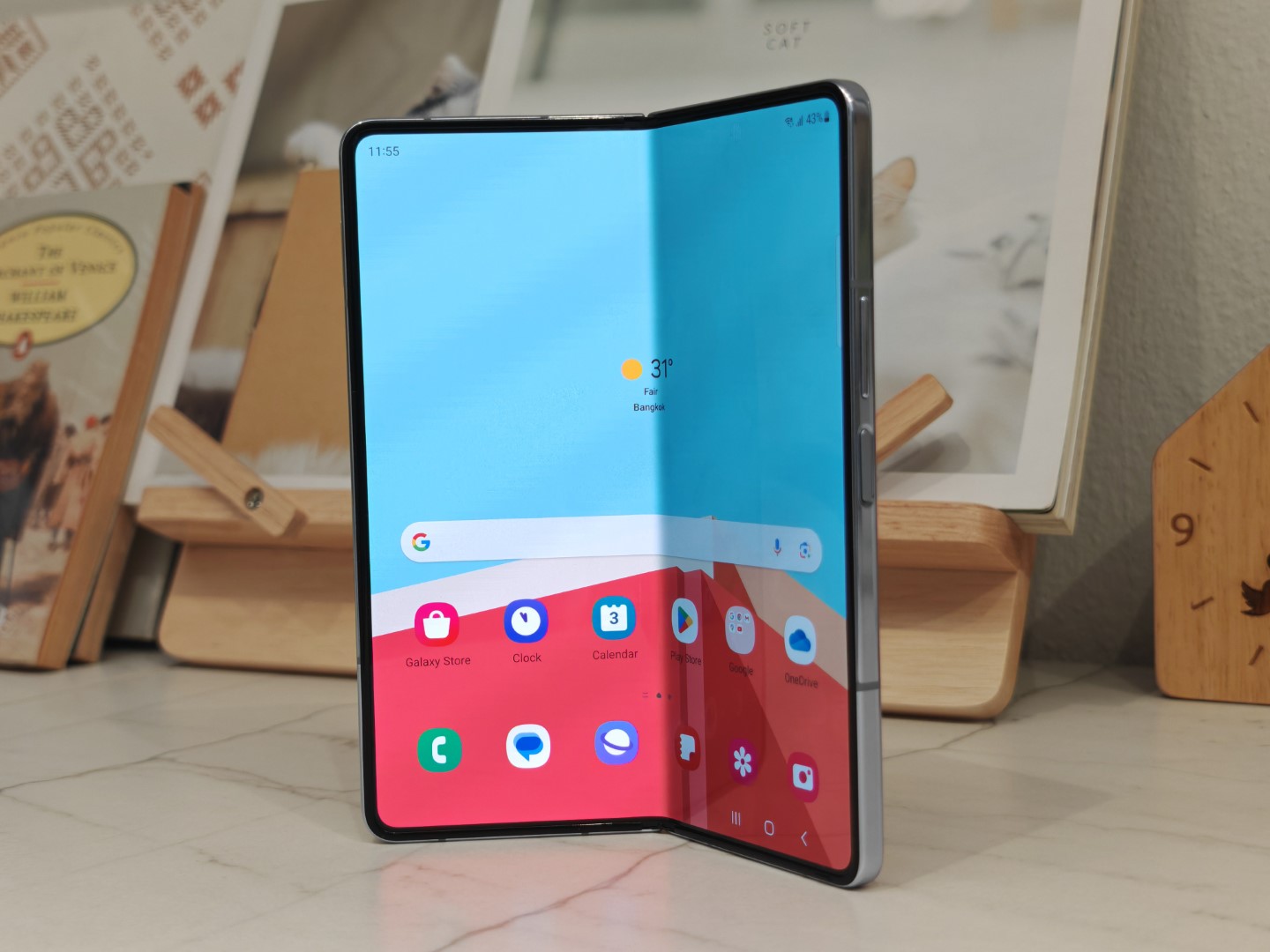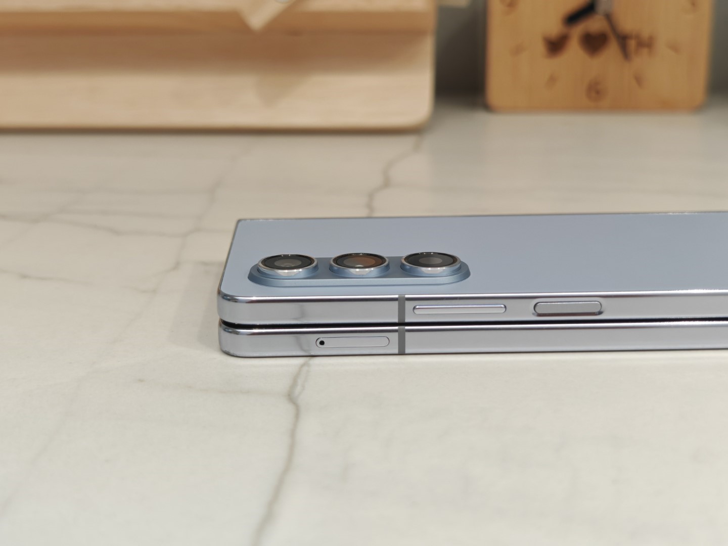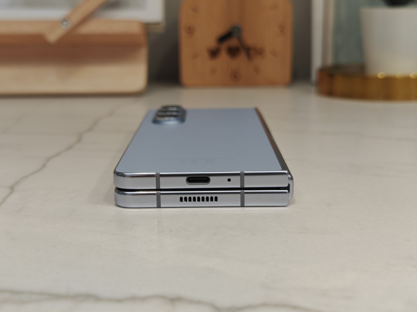 ถ้าไปวางเทียบกับรุ่น Galaxy Z Fold4 นี่จะเห็นได้ชัดเลยว่าพับแล้วมันบางลงกว่าเดิมเยอะ