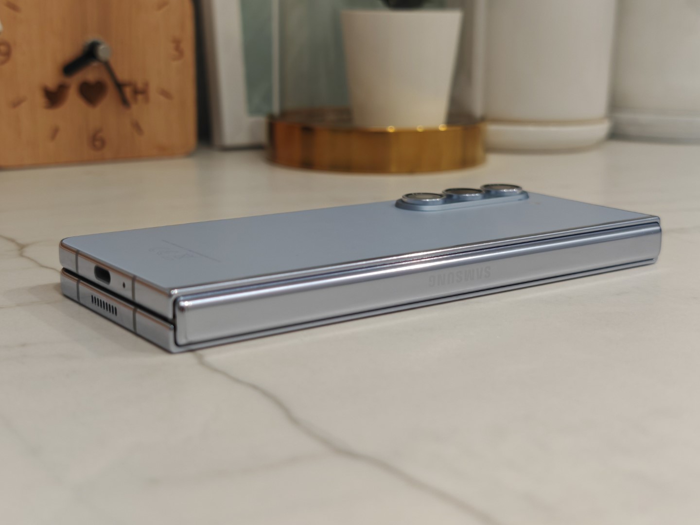 ไม่ใช่ว่าจะบางลงเฉพาะตอนพับจอเท่านั้นนะ แต่ตอนกางจอออกมาก็ยังบางลงกว่ารุ่นที่แล้วด้วย โดยเหลือแค่ 13.4 มม. เท่านั้น เทียบกับรุ่นก่อน 15.8 มม. ส่วนน้ำหนักก็เบาลงเหลือ 253 กรัม จากรุ่นก่อน 263 กรัม แต่เห็นบางลงเบาลงแบบนี้ ก็ไม่ใช่ว่าจะก๊องแก๊งนะ เพราะเฟรมเครื่องทำจากโลหะ Armor Aluminum ที่มีความทนทานสูง นอกจากนี้ ยังได้รับมาตรฐานทนน้ำ IPX8 อีกด้วย จะน้ำหกใส่ จะฝนตกหนัก ก็ไม่เป็นปัญหา