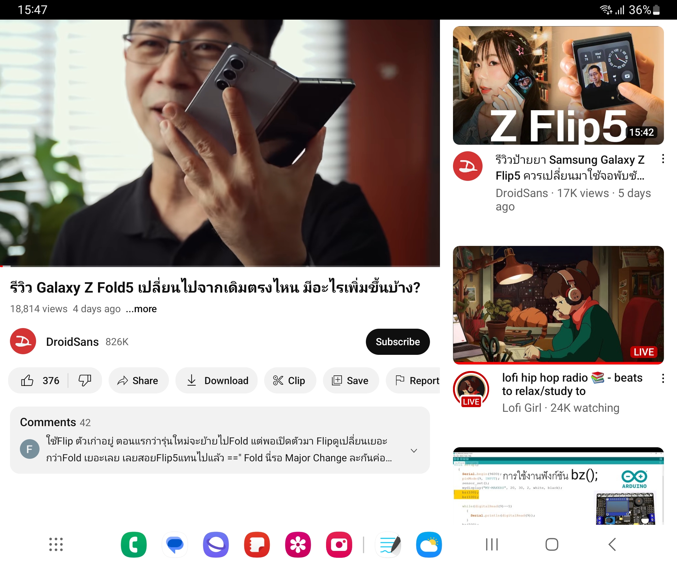 ด้วยความที่ Galaxy Z Fold5 มี 2 หน้าจอ แต่การสลับใช้งานต่าง ๆ ไม่ได้ทำให้เกิดการติดขัดเลย สมมติเรานั่งดู YouTube ด้วยจอด้านหน้าอยู่ แล้วเกิดอยากดูจอใหญ่ขึ้นมา ก็แค่กางจอออกมา คลิป YouTube ที่เรากำลังดูอยู่ก็จะเล่นต่อบนหน้าจอใหญ่ให้เลย ไม่ต้องมากดเปิดแอปหาแอปอีกรอบ