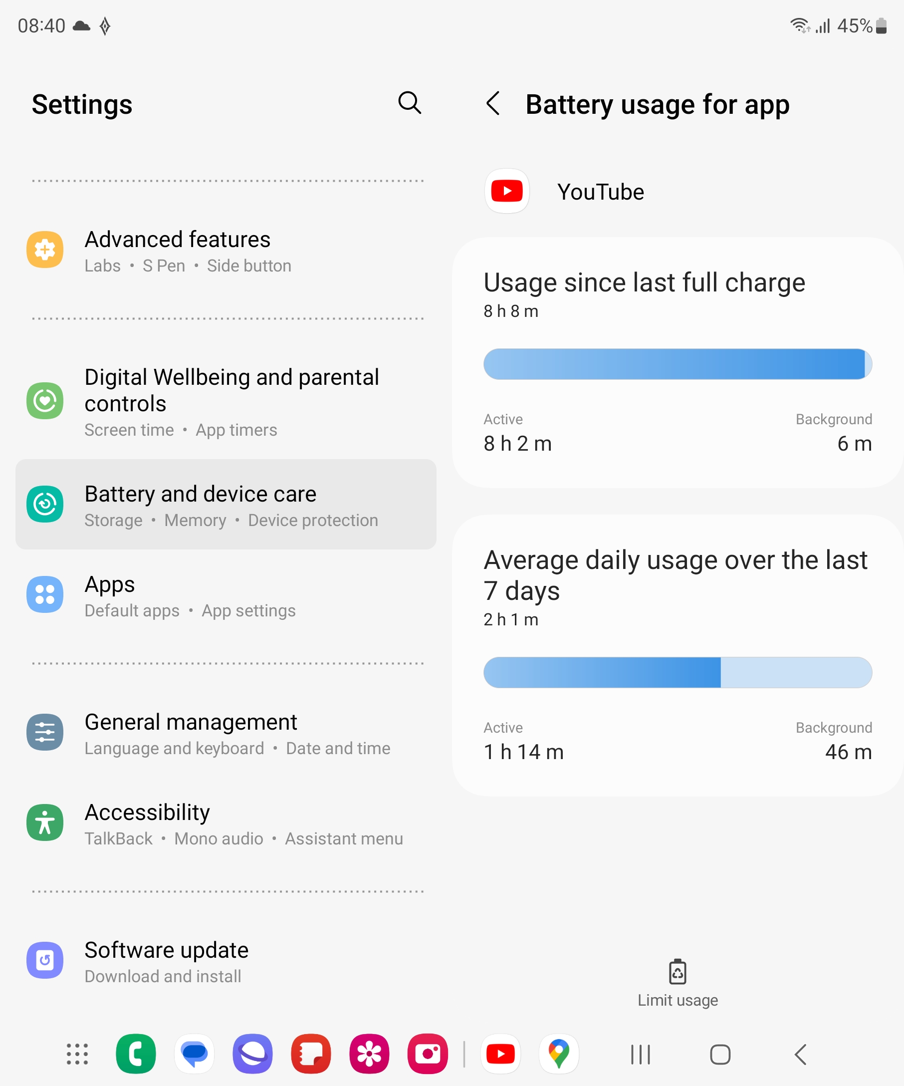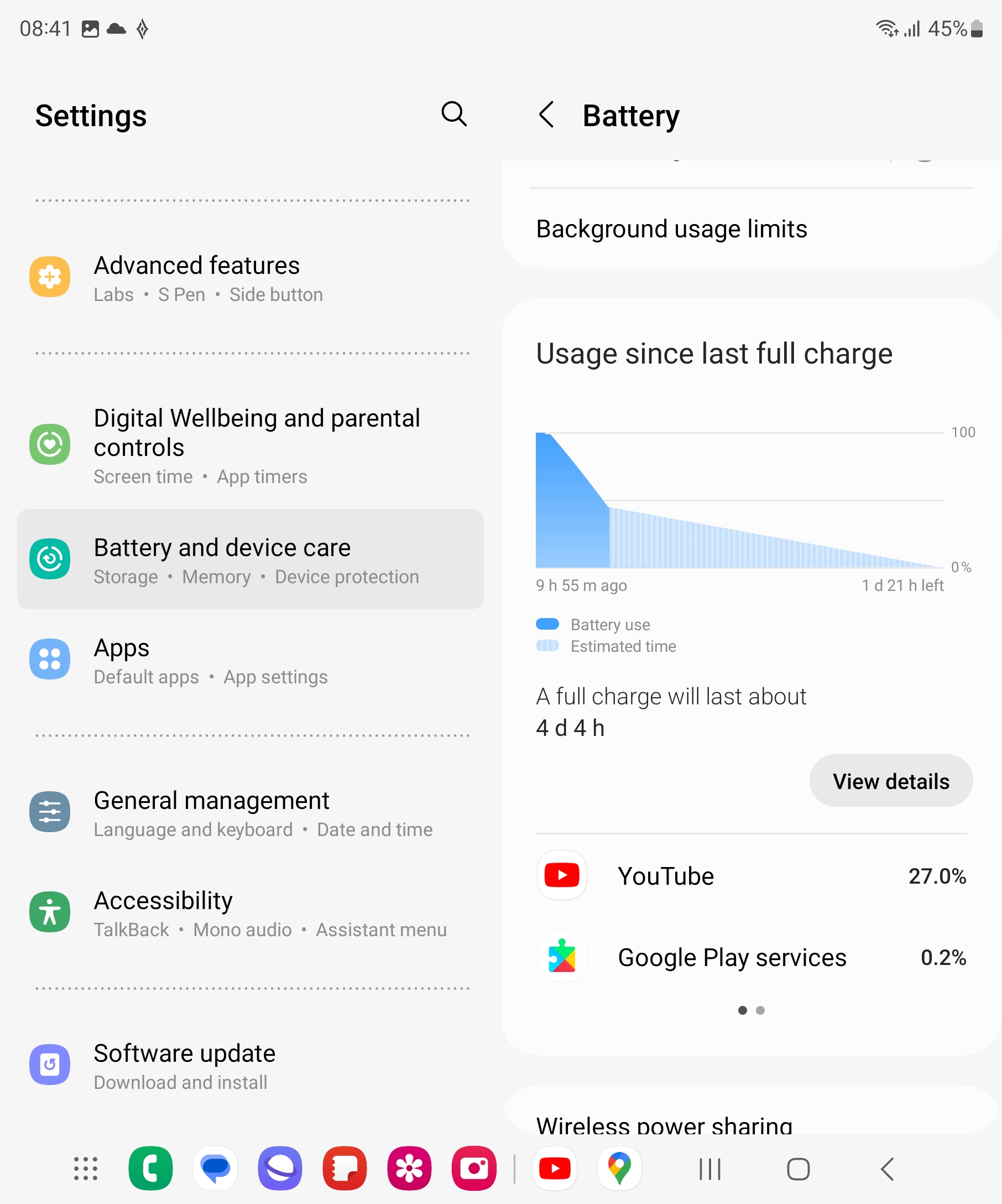ลองทดสอบแบบหนักหน่วงด้วยการเปิด YouTube ความละเอียด FHD บนหน้าจอใหญ่ เชื่อมต่อกับ WiFi ความสว่างหน้าจอ 60% และลำโพง 40% (ลำโพงเสียงดังมาก ไม่ต้องเร่ง Volume เยอะ) ซูมภาพให้เต็มจอ เปิดทิ้งไว้ 8 ชม. ยังเหลือแบตเตอรี่อีกตั้ง 45% เลยนะ