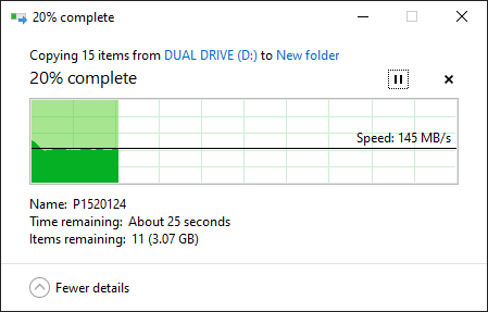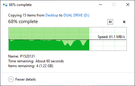 ถัดมาลองทดสอบโอนไฟล์วิดีโอทั้งหมด 14 ไฟล์ รวมขนาด 3.86GB ซึ่งสามารถทำได้รวดเร็วใช้ได้เลย โดยเฉพาะค่า Read ที่ก๊อปวางไฟล์เพียงราวๆ 30 วินาทีเท่านั้น ส่วนค่า Write ก็ใช้เวลาราวๆ 3 นาทีด้วยกัน