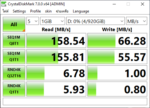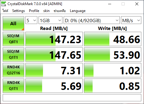 คราวนี้เราจะมาทดสอบประสิทธิภาพเจ้า Sandisk Ultra Dual Drive Luxe กันบ้างโดยเครื่องที่ทีมงานใช้นั้นจะเป็นโน้ตบุ๊ค Windows ที่มีพอร์ต Thunderbolt 3 และ USB type A 3.1 Gen 1 ซึ่งจะทดสอบบนโปรแกรม CrytaDiskMark 7.0.0 ได้ผลออกมาเป็นดังนี้