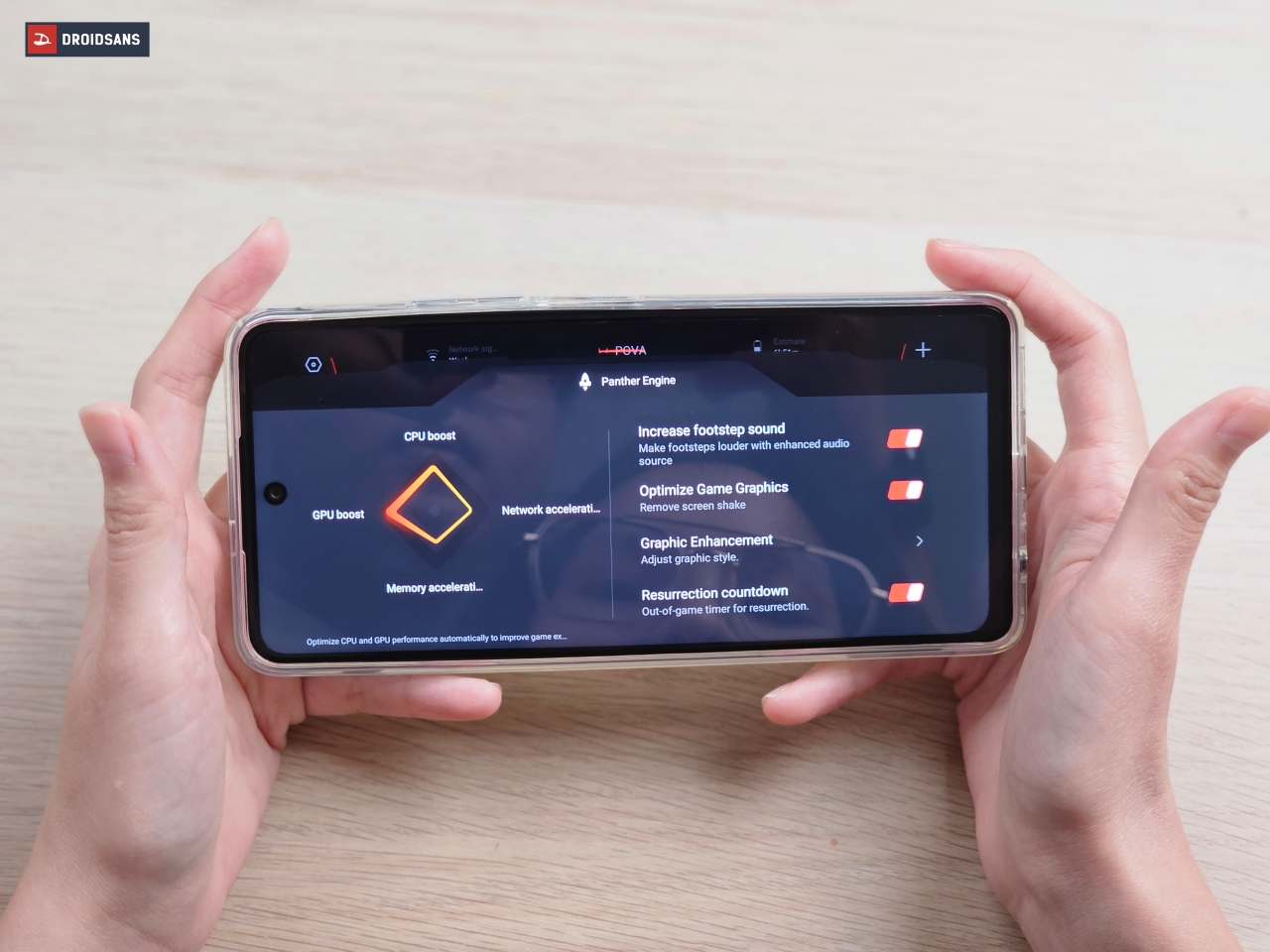 นอกจากฝั่งฮาร์ดแวร์แล้ว TECNO Pova 5 ยังมาพร้อมกับฟีเจอร์ Panther Game Engine 2.0 ซึ่งเป็นโหมดสำหรับการเล่นเกมโดยเฉพาะ ช่วยรีดทั้งประสิทธิภาพทั้ง CPU และ GPU ให้เล่นเกมได้ลื่นไหลดียิ่งขึ้น สามารถปรับโหมดภาพสีสันต่าง ๆ ให้เข้ากับการเล่นเกม ลดการสั่นไหวของตัวภาพ รวมถึงช่วยเร่งเสียงฝีเท้าในเกม เพื่อให้ได้ยินทิศทางของศัตรูได้ชัดยิ่งขึ้น และในขณะเล่นเกมยังสามารถปัดที่ข้าง ๆ หน้าจอเพื่อเรียกใช้เมนูลัด อย่างการแคปหน้าจอ อัดวิดีโอหน้าจอ รวมถึงปิดแจ้งเตือน โดยที่ไม่ต้องออกจากตัวเกมเพื่อตั้งค่าให้เสียเวลา