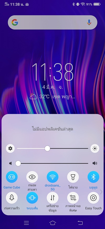 สำหรับแถบรายการแจ้งเตือนต่างๆ นั้นก็ต้องลากนิ้วจากด้านบนของจอภาพลงมาเหมือนปกติ แต่การตั้งค่าด่วนหรือเปิด Quick Setting นั้นต้องเลื่อนจากด้านล่างของจอขึ้นมา