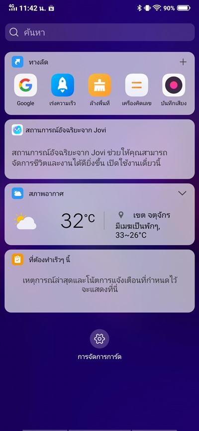 ปุ่มนำทาง Navigation Key ด้านล่างนั้นจะเลือกเปิดแตะเอา หรือจะปิดแล้วใช้เป็น gesture ก็ได้ ส่วนหากเราปัดหน้าจอไปทางซ้ายก็จะเจอกับหน้าผู้ช่วยของ Jovi Assistant ที่จะเก็บเอาข้อมูลสำคัญๆ ส่วนตัวและสิ่งที่เราติดตาม เช่นตารางนัดหมาย สภาพอากาศ หรือแอปที่ใช้บ่อยๆ