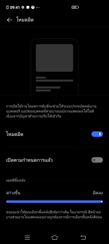 นอกจากนั้นยังมีโหมดมืด สำหรับใครที่ชอบโทนสีเข้มๆ ดำๆ ซึ่งนอกจากจะลดภาระสายตาแล้ว ยังช่วยประหยัดแบตให้กับหน้าจอแบบ AMOLED ได้ด้วย