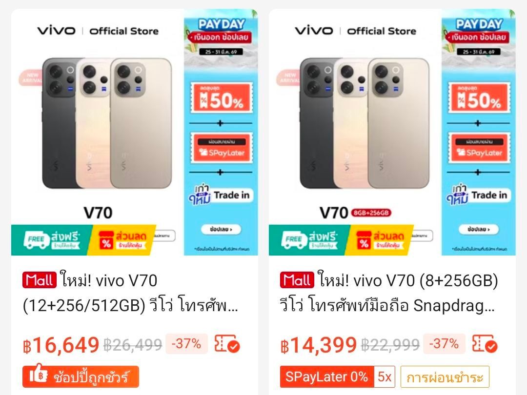 ราคา vivo V70 บนหน้าร้าน Shopee (ณ วันที่ 28 มี.ค. 2569)