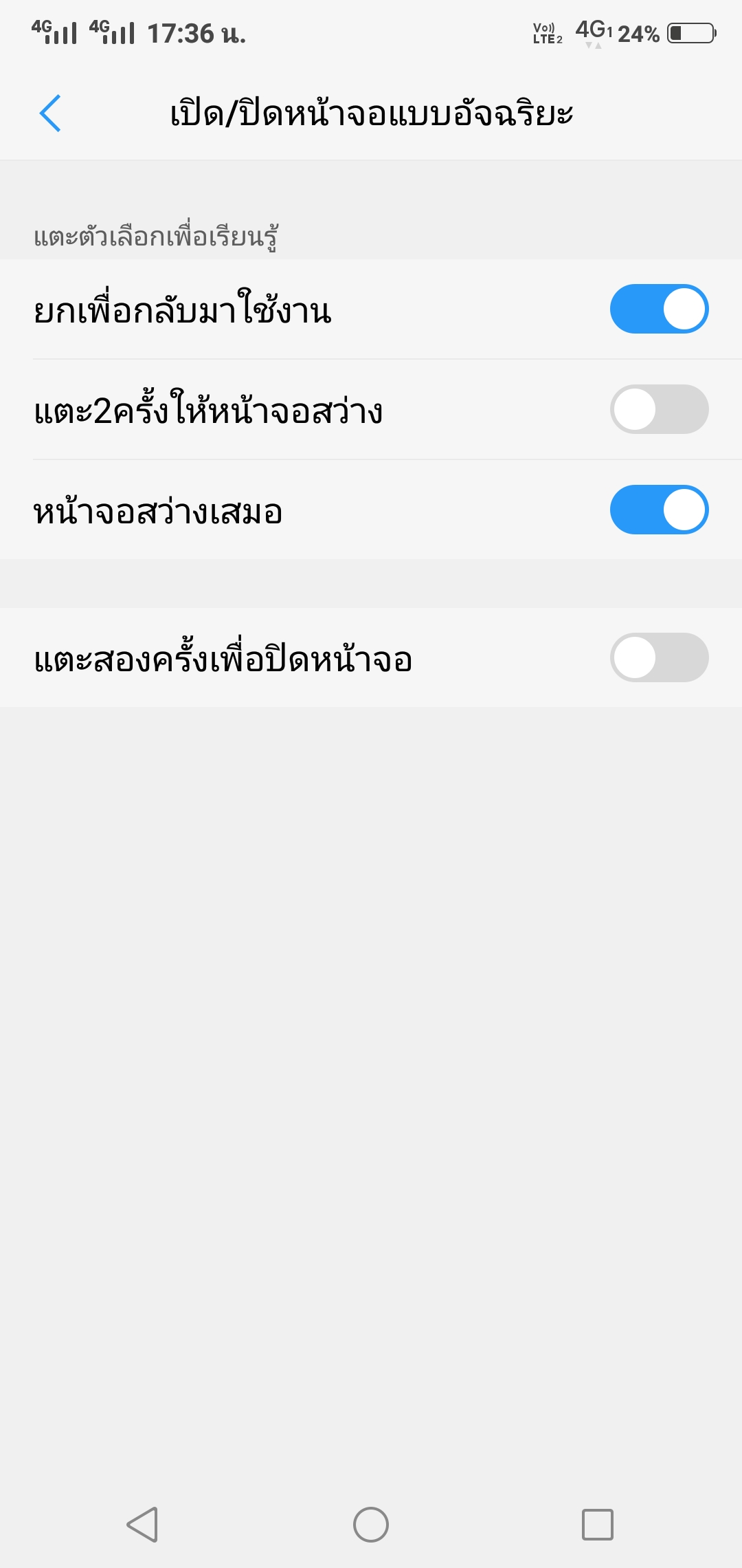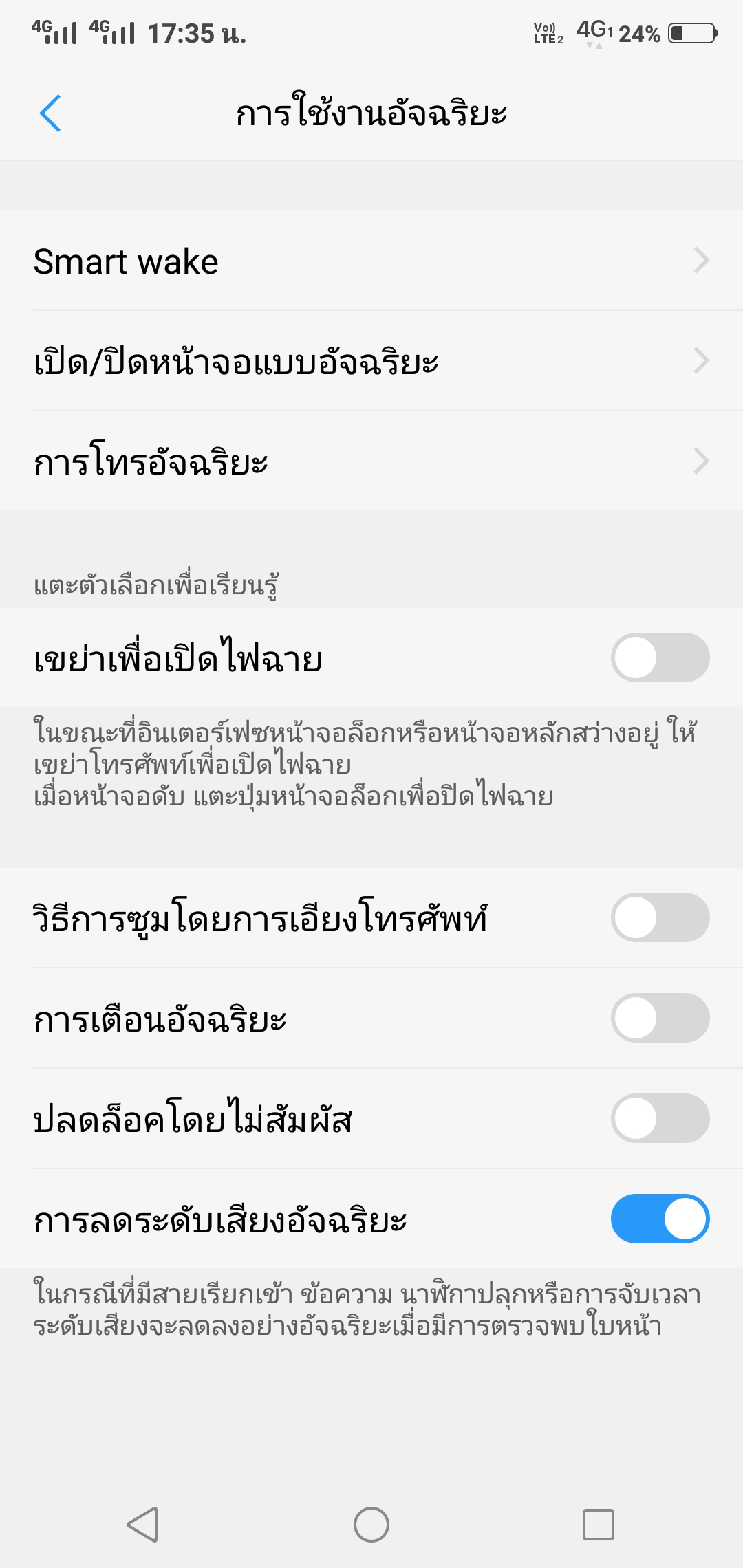หากใครอยากได้หน้าจอโล่งๆ เต็มๆ ไม่อยากมีแถบนำทาง (ปุ่มโฮม ย้อนกลับ แอปล่าสุด) ด้านล่าง เราสามารถเลือกเปลี่ยนรูปแบบกานำทางได้ โดยเปลี่ยนเป็นแบบ gesture หรือลากนิ้วแทน โดยการลากนิ้วจากตำแหน่งล่างซ้ายของจอขึ้นมาคือทางซ้ายคือเปิดแผง shortcut, ลากนิ้วจากด้าล่างบริเวณกลางจอขึ้นคือกลับหน้าโฮม และหากค้างนิ้วเอาไว้คือดูรายการแอปทั้งหมดที่เปิด และลากนิ้วจากทางขวาล่างขึ้นมาคือปุ่มย้อนกลับ