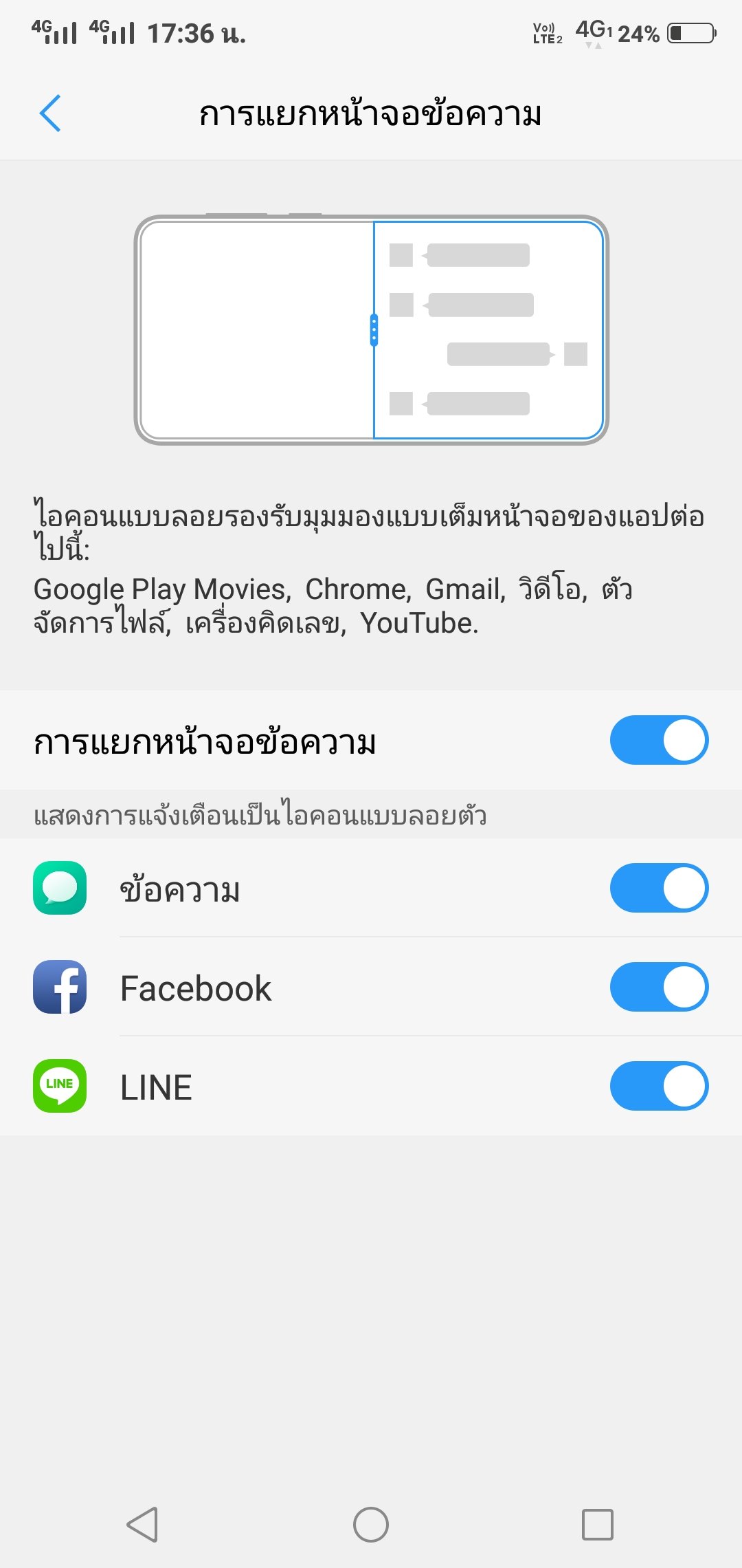 นอกจากนั้นเรายังสามารถเรียกหน้าต่าง pop up สำหรับพิมพ์ข้อความตอบกลับ เวลาเราเล่นเกม ดูหนัง แล้วมีแจ้งเตือนเข้ามา เราไม่ต้องสลับแอปออกไป แต่จะเป็นหน้าต่างที่เรียกว่า แยกหน้าจอข้อความ ปรากฏขึ้นมา
