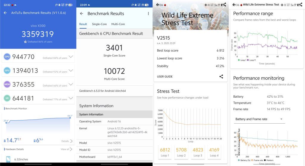 ประสิทธิภาพของ vivo X300 ถือว่าอยู่ในระดับเรือธงเต็มตัว เพราะรอบนี้ได้ใช้ชิปตัวเดียวกับรุ่น Pro คือ MediaTek Dimensity 9500 ซึ่งเป็นชิประดับท็อปของปี 2025 ประกบมากับชิปเสริมด้านภาพ vivo V3+ ที่ช่วยแบ่งเบาภาระงานประมวลผลเกี่ยวกับภาพถ่ายและวิดีโอออกไป ทำให้ชิปหลักไม่ต้องทำงานหนักเกินจำเป็น ทั้งหมดนี้ทำให้การใช้งานทั่วไปเป็นไปอย่างลื่นไหลมาก ไม่ว่าจะเล่นโซเชียล สลับแอป ดูหนัง ฟังเพลง หรือทำธุรกรรมออนไลน์ ทุกอย่างตอบสนองทันใจแบบไม่มีจังหวะหน่วง ความร้อนก็จัดการได้ดีมาก แทบไม่รู้สึกว่าเครื่องอุ่นเลย