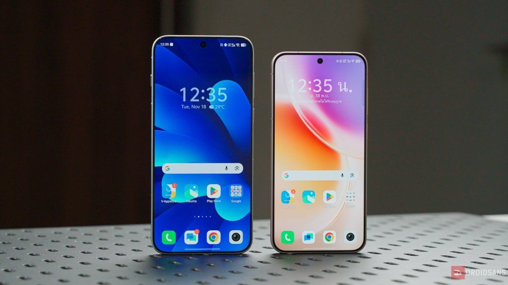 ฟีลลิ่งการจับถือยังคงเน้นความพรีเมียมอย่างที่ vivo ทำได้ดีเสมอ ด้านหลังเป็นกระจกผิวด้านที่ให้สัมผัสสบายมือ ไม่ลื่นง่าย ขอบเครื่องเป็นอะลูมิเนียมทรงเหลี่ยมที่เข้าคู่กับหน้าจอแบนได้ลงตัว เครื่องดูบาง คลีน และมีน้ำหนักสมดุล นอกจากนี้ทั้งสองรุ่นยังรองรับมาตรฐานกันน้ำกันฝุ่น IP68 และ IP69 ซึ่งถือว่าให้มาครบกว่าหลายแบรนด์ สามารถโดนน้ำลึก 1.5 เมตรได้นาน 30 นาที และทนน้ำแรงดันสูงได้ด้วย
